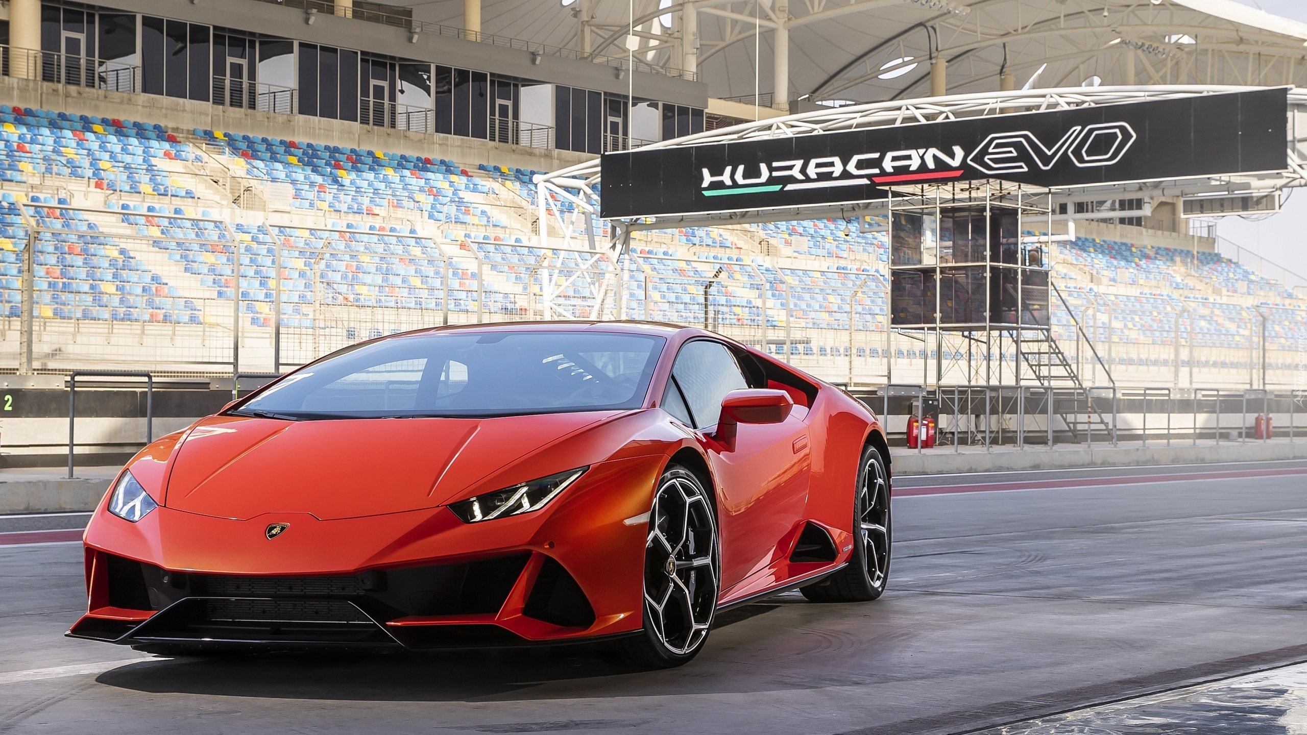 Edytor tapety: Czerwone Lamborghini Huracan EVO na stadionie