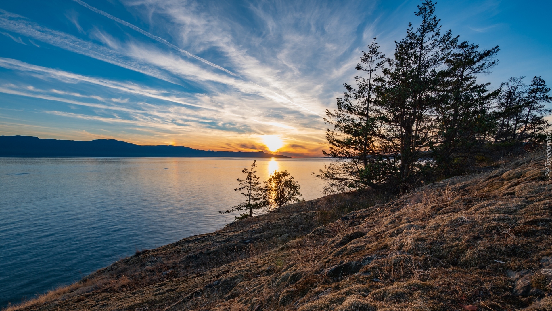 Edytor tapety: Drzewa na brzegu jeziora o poranku