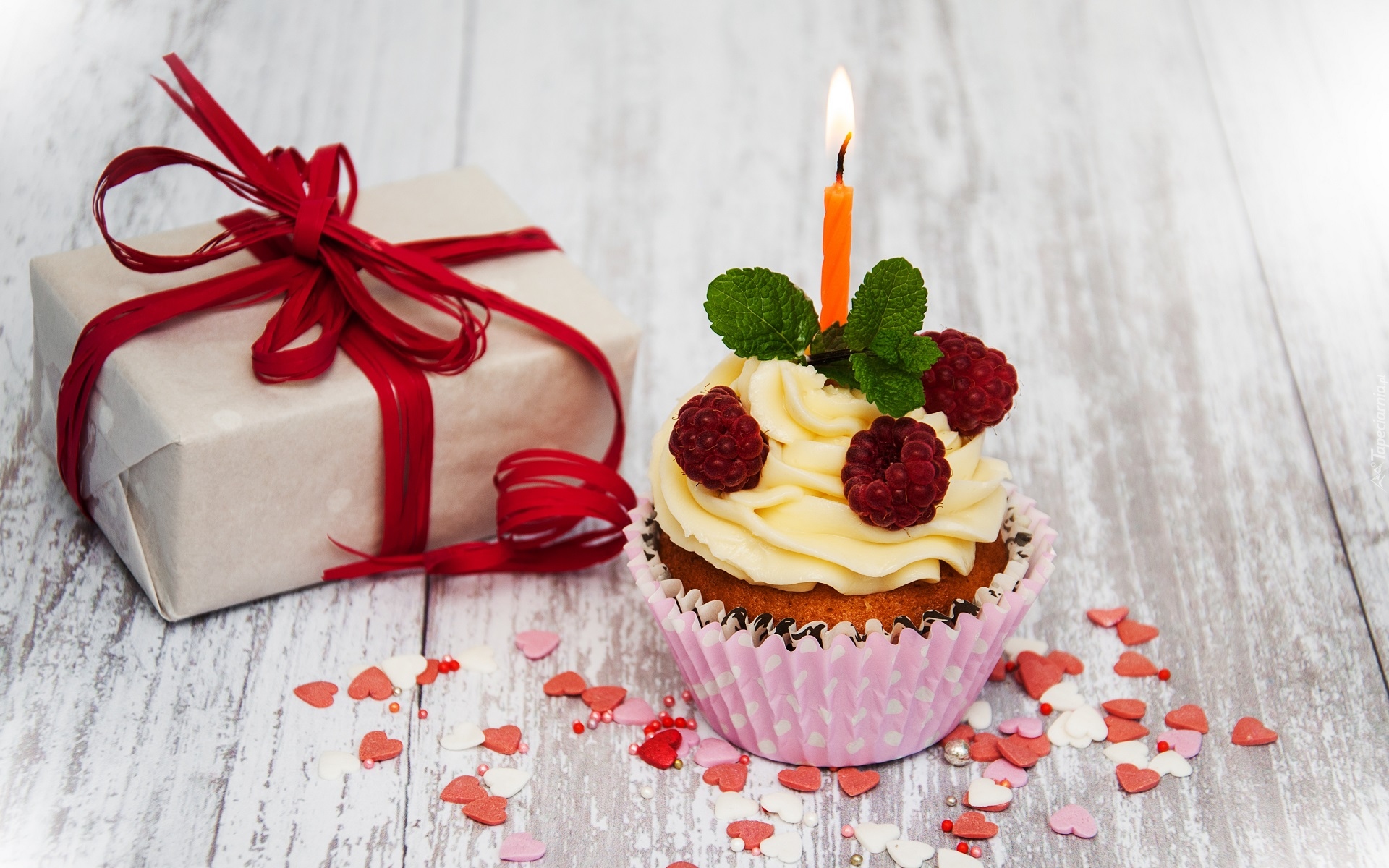 Edytor tapety: Babeczka ze świeczką i prezent na urodziny