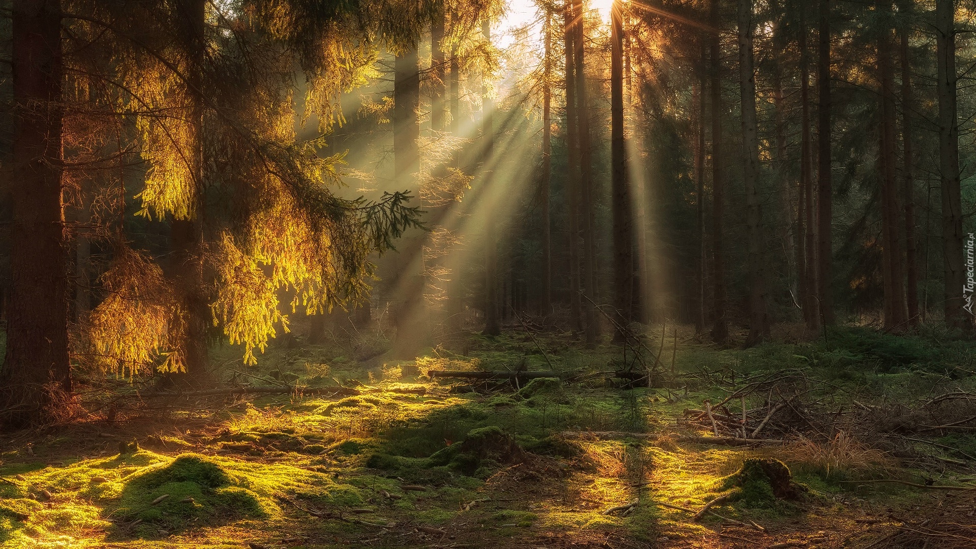 Edytor tapety: Rozświetlone drzewa w lesie iglastym
