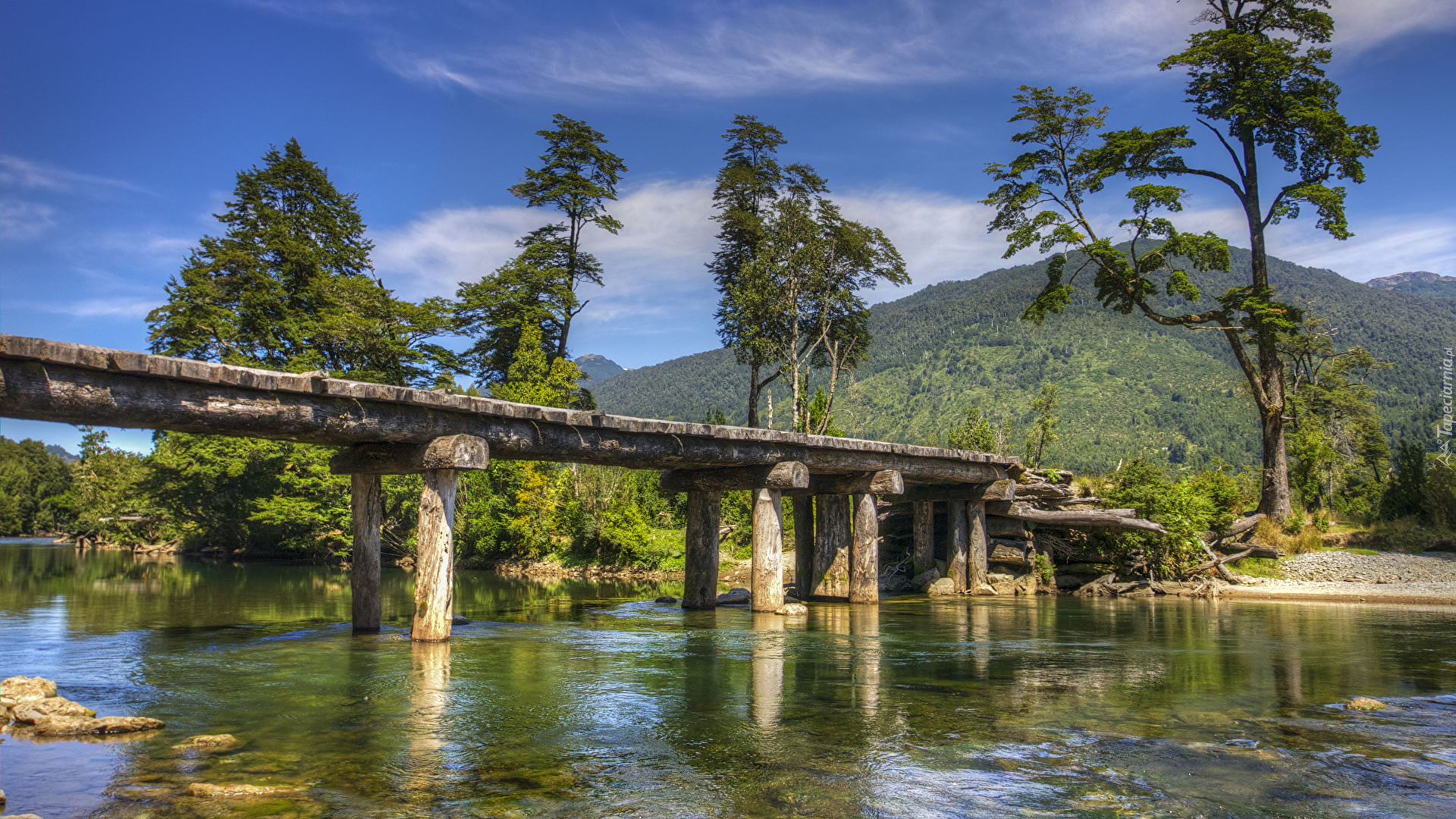 Edytor tapety: Drzewa obok mostu nad rzeką