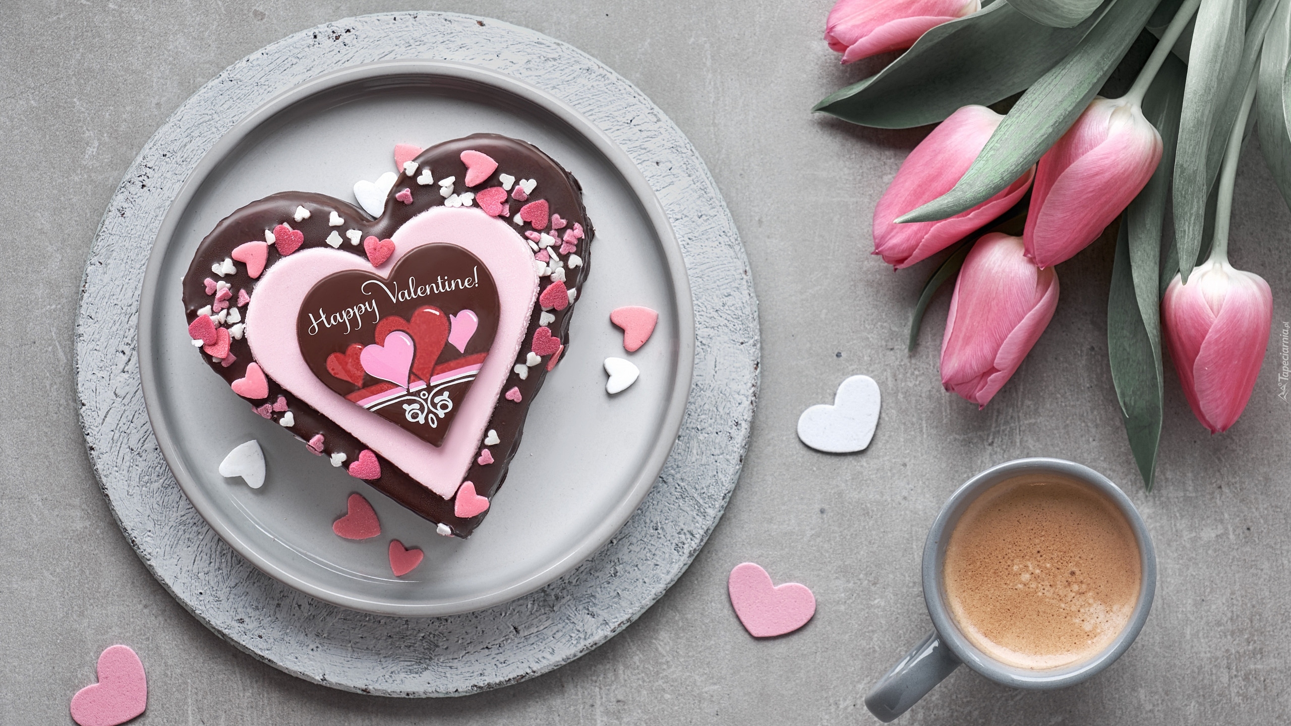 Edytor tapety: Czekoladowe serce obok tulipanów i kawy