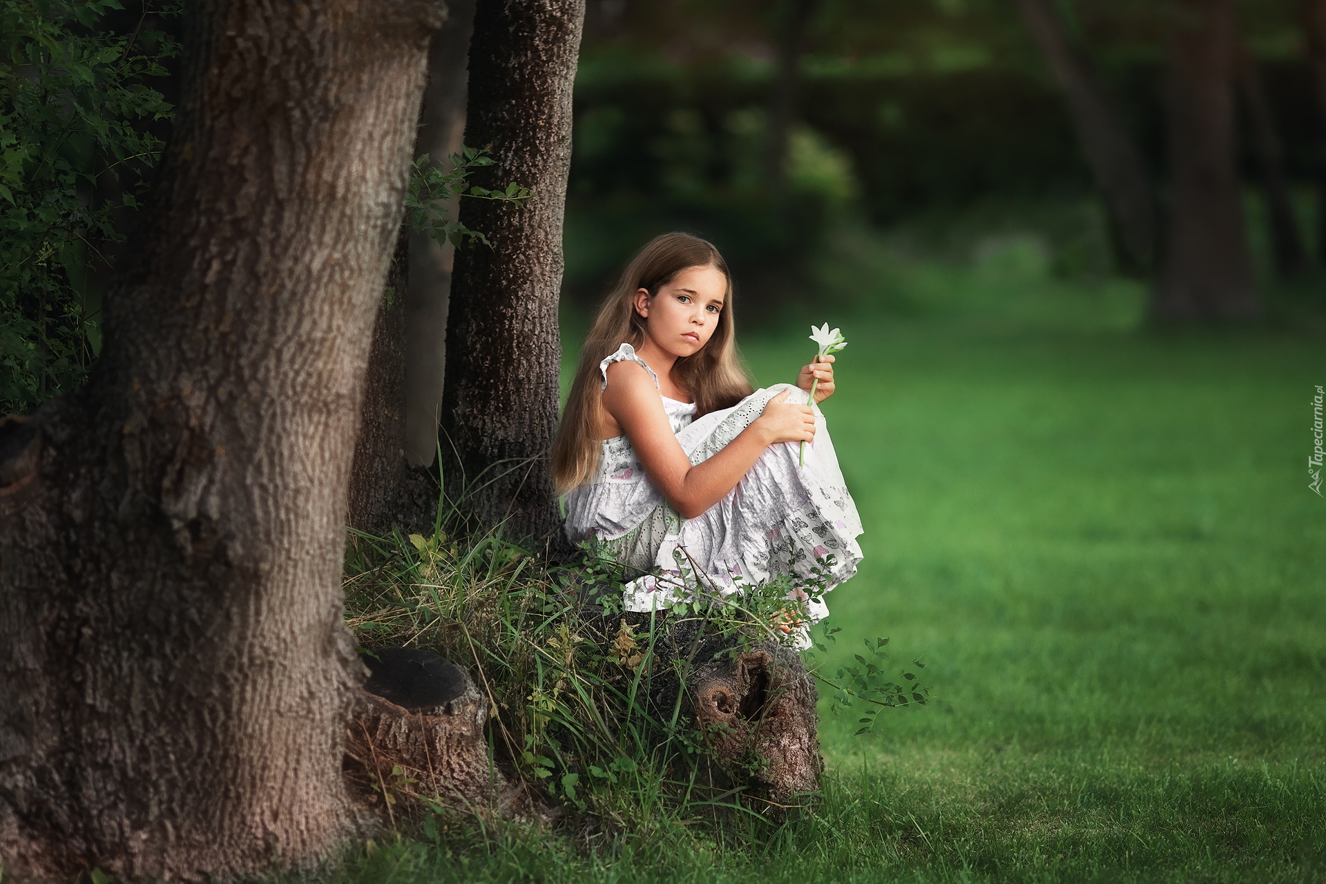 Edytor tapety: Dziewczynka w białej sukience siedząca na pniu drzewa