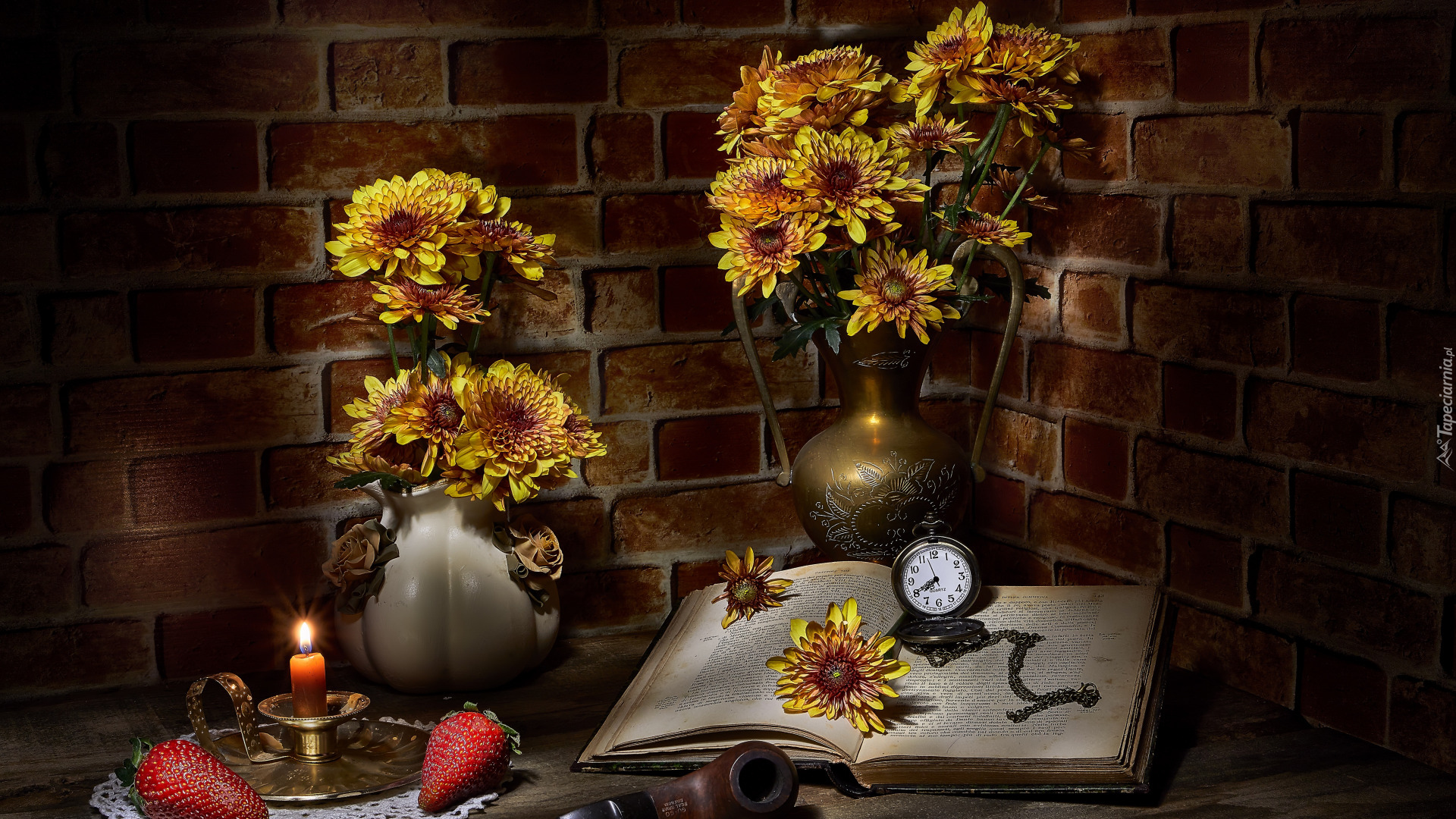 Edytor tapety: Chryzantemy obok książki i świeczki