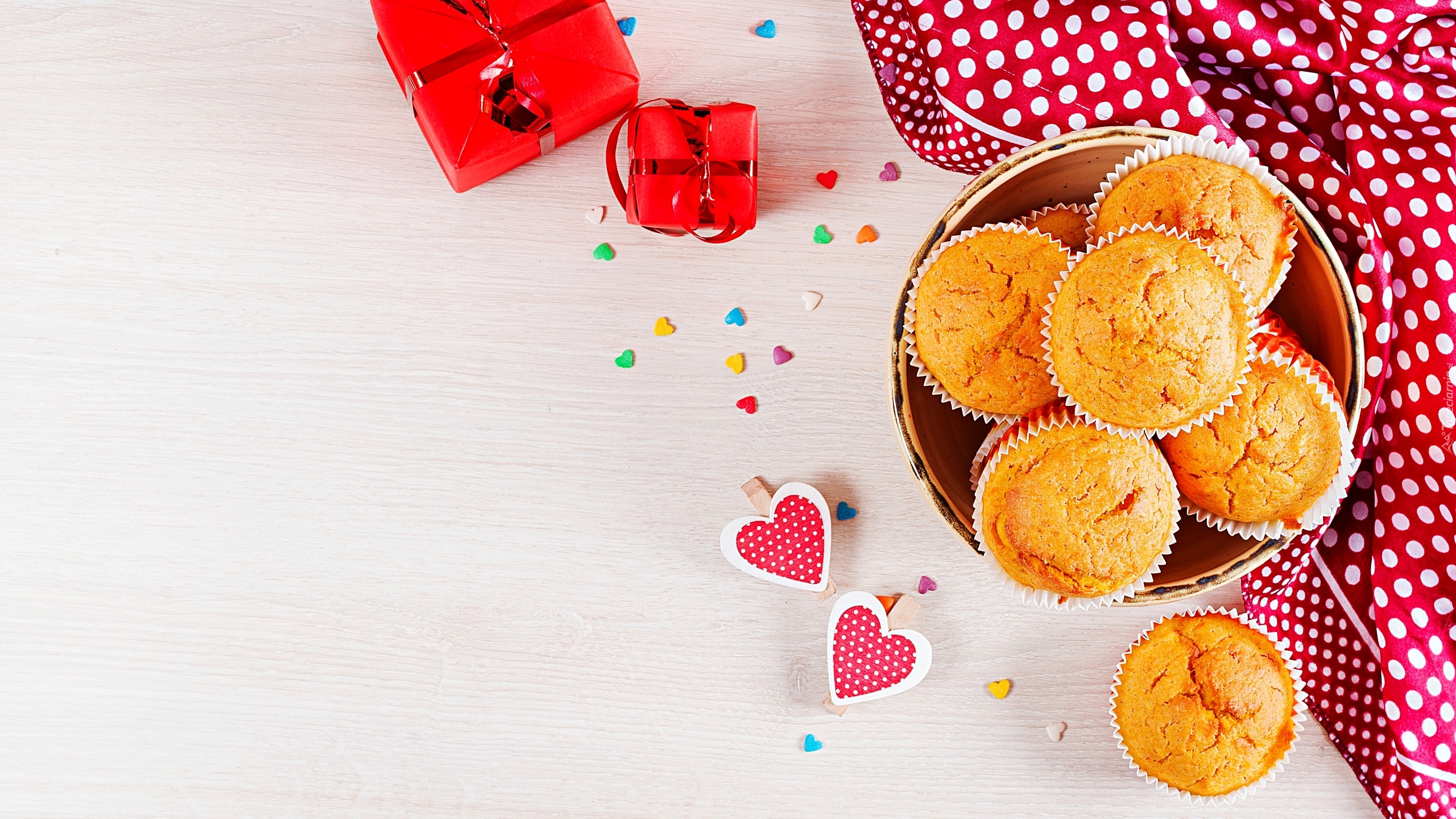 Edytor tapety: Prezenty obok pudełka z babeczkami