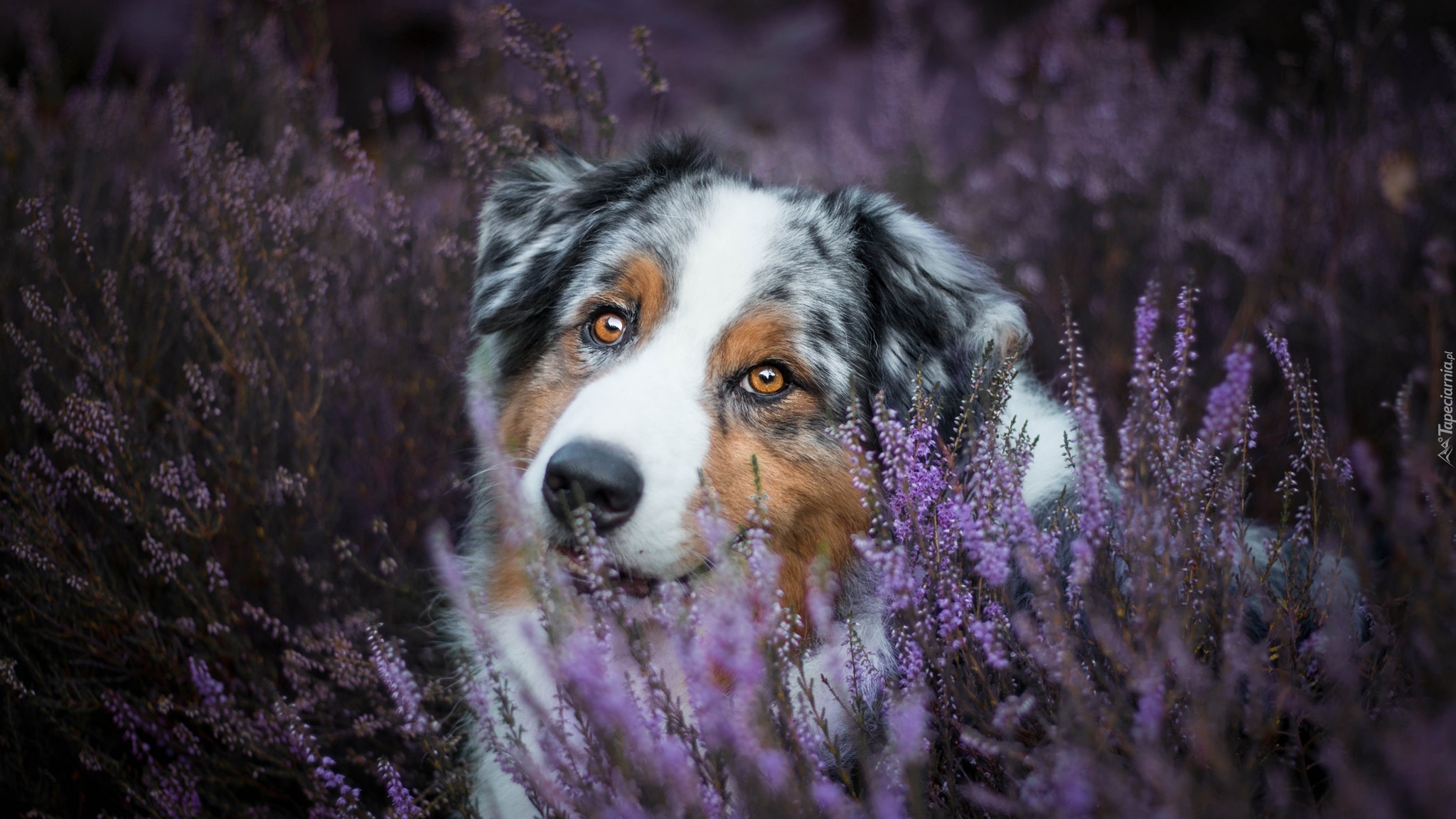 Edytor tapety: Owczarek australijski wśród wrzosów