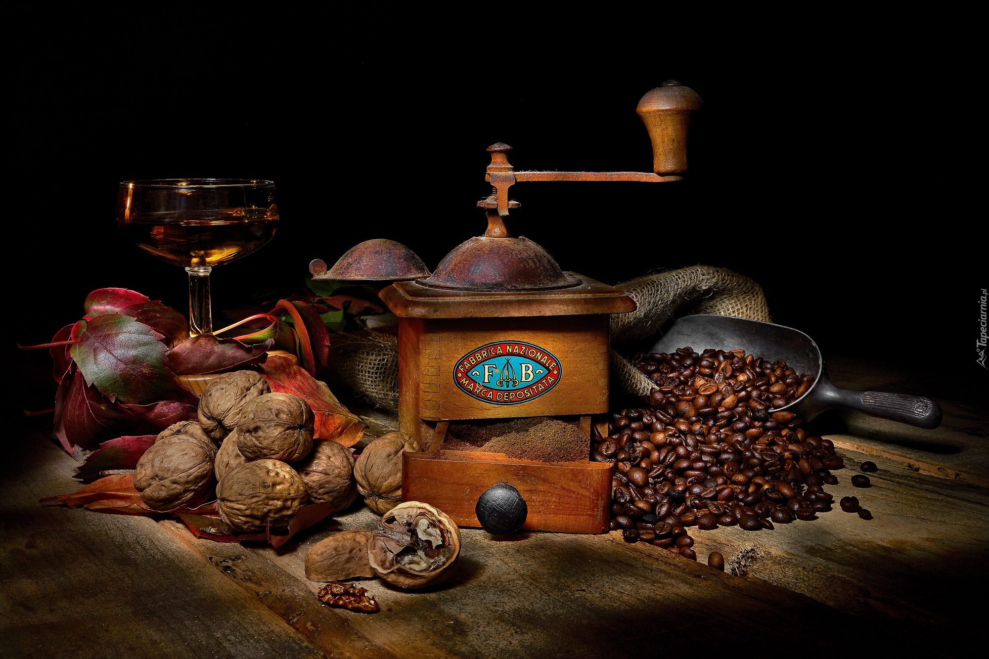 Edytor tapety: Ziarna kawy i orzechy obok młynka