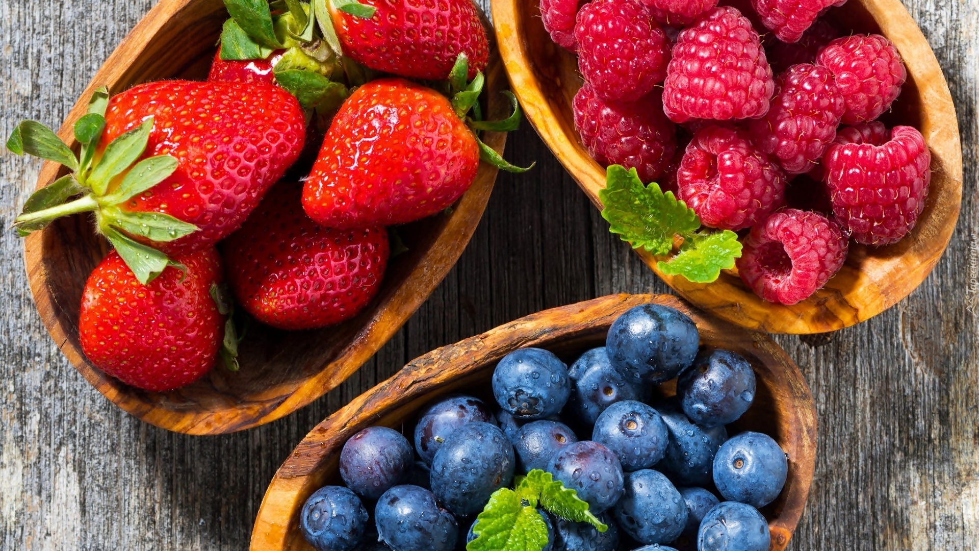 Edytor tapety: Miseczki z truskawkami, malinami i borówkami