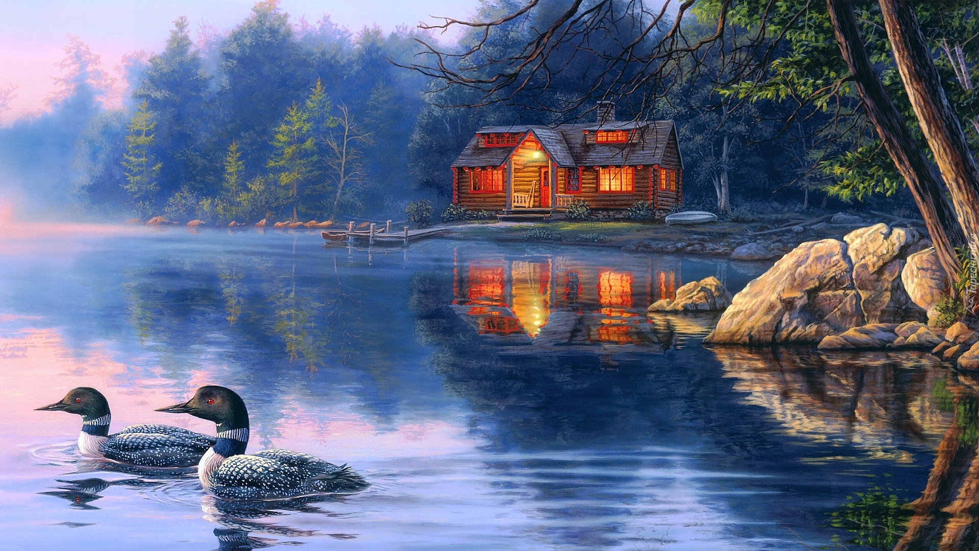 Edytor tapety: Oświetlony dom nad jeziorem w lesie