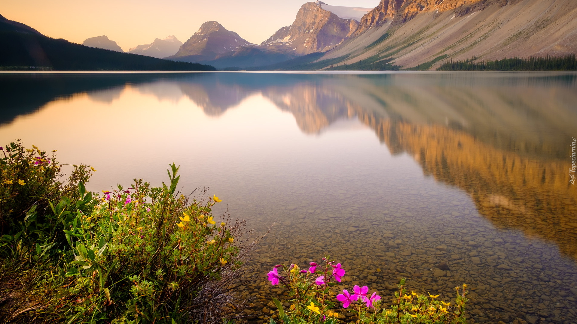 Edytor tapety: Kolorowe kwiaty na brzegu jeziora Bow Lake