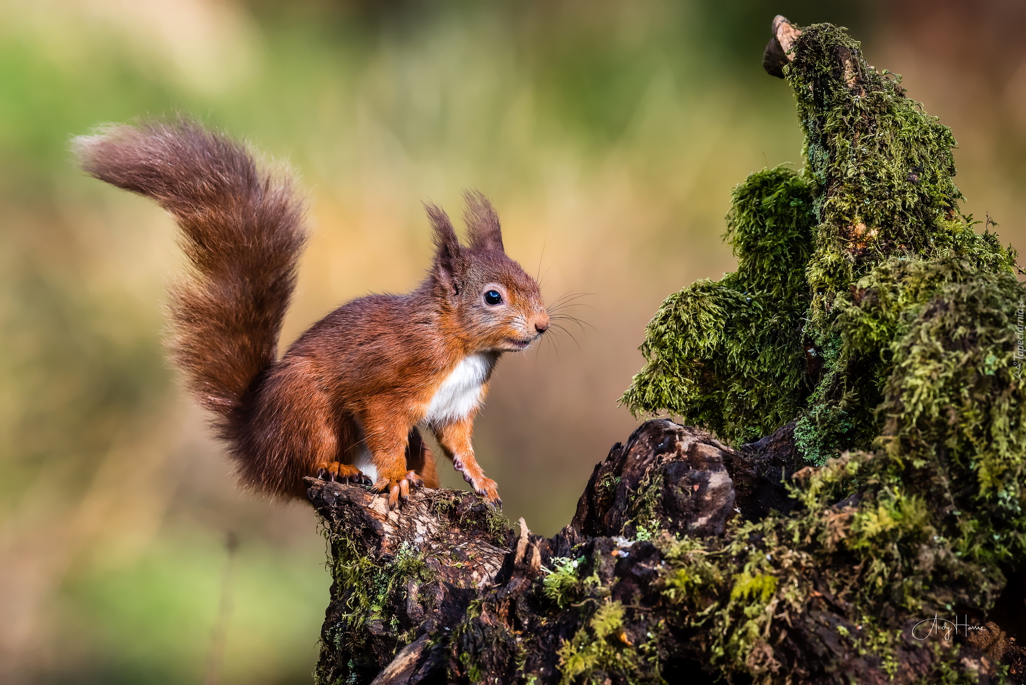 Edytor tapety: Wiewiórka na pniu omszałego drzewa