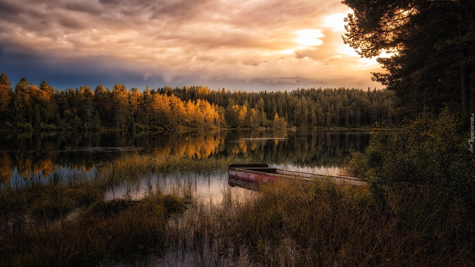 Edytor tapety: Łódka w zaroślach na jeziorze