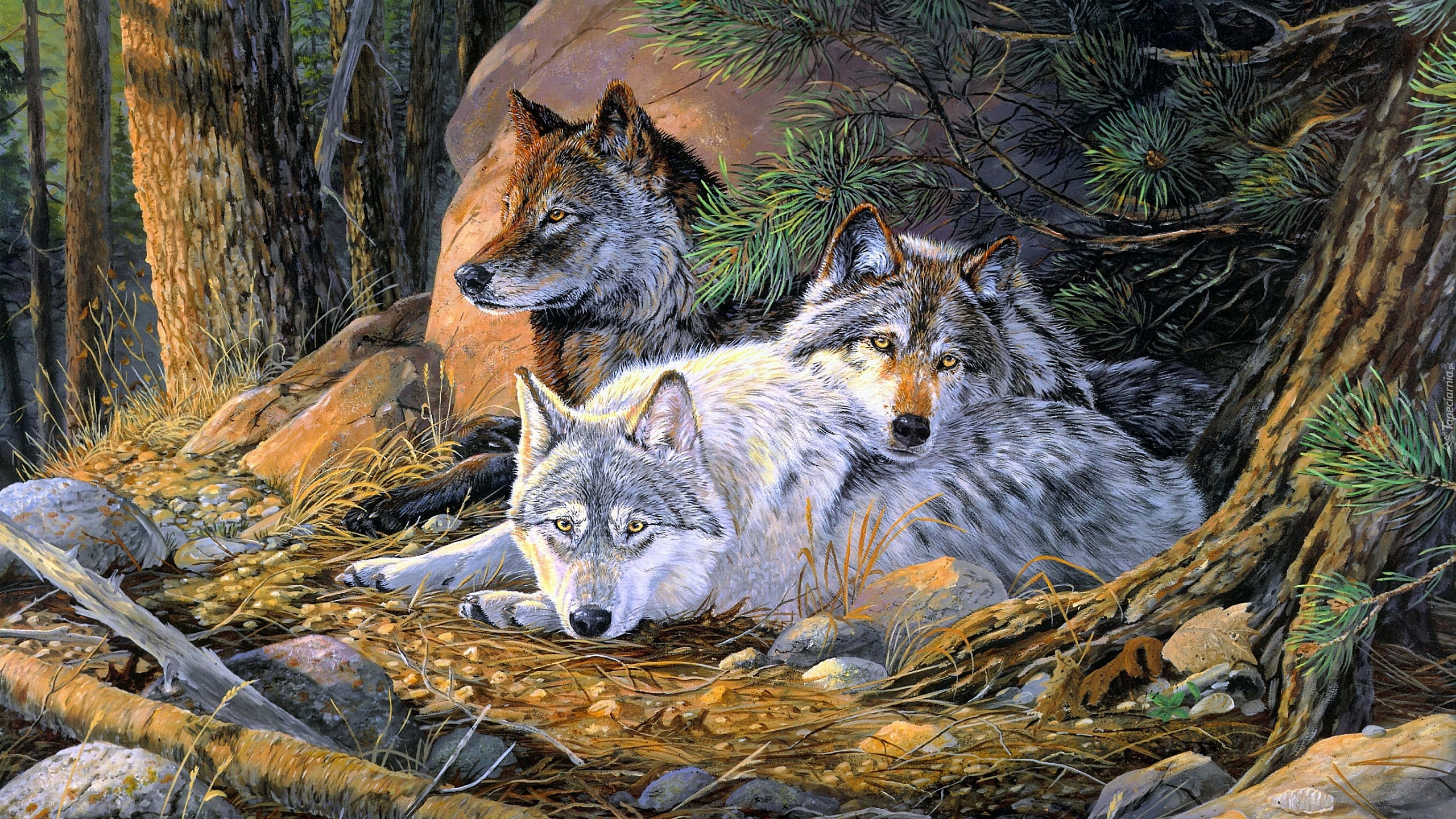 Edytor tapety: Trzy wilki pod drzewami w lesie