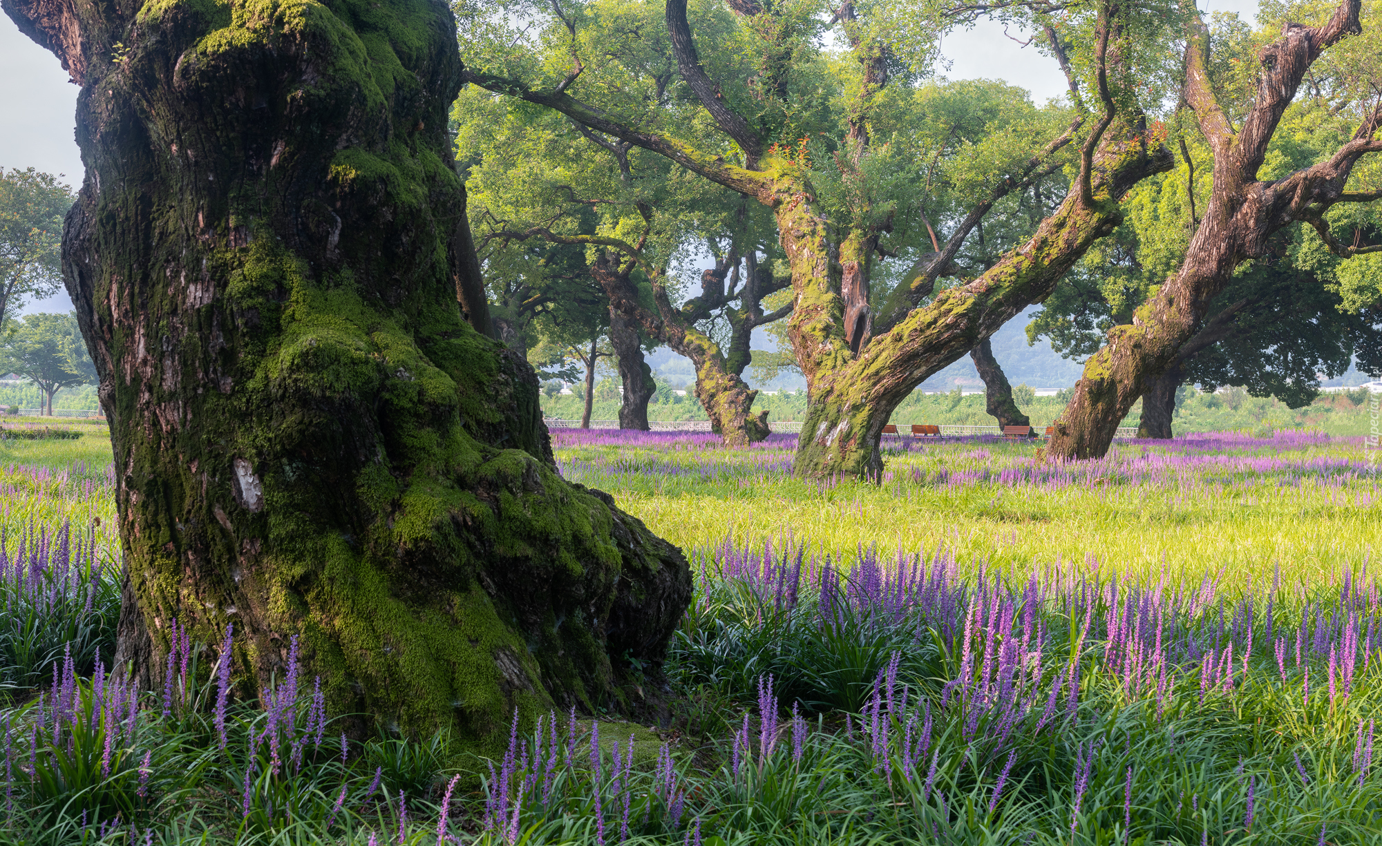 Edytor tapety: Kwiaty i drzewa w parku
