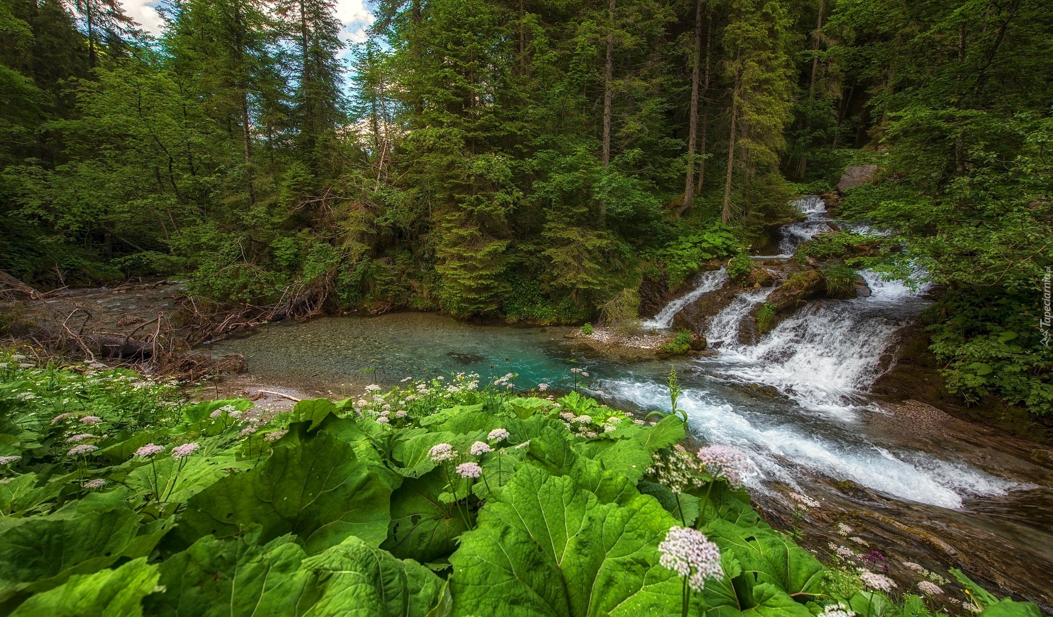 Edytor tapety: Kwiaty na brzegu leśnej rzeki
