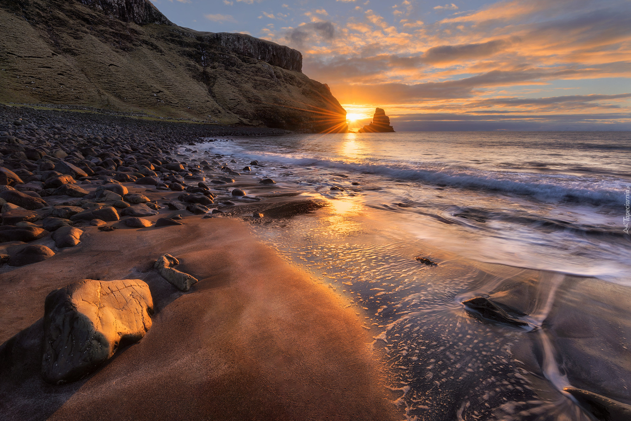 Edytor tapety: Wschód słońca nad kamienistym brzegiem morza