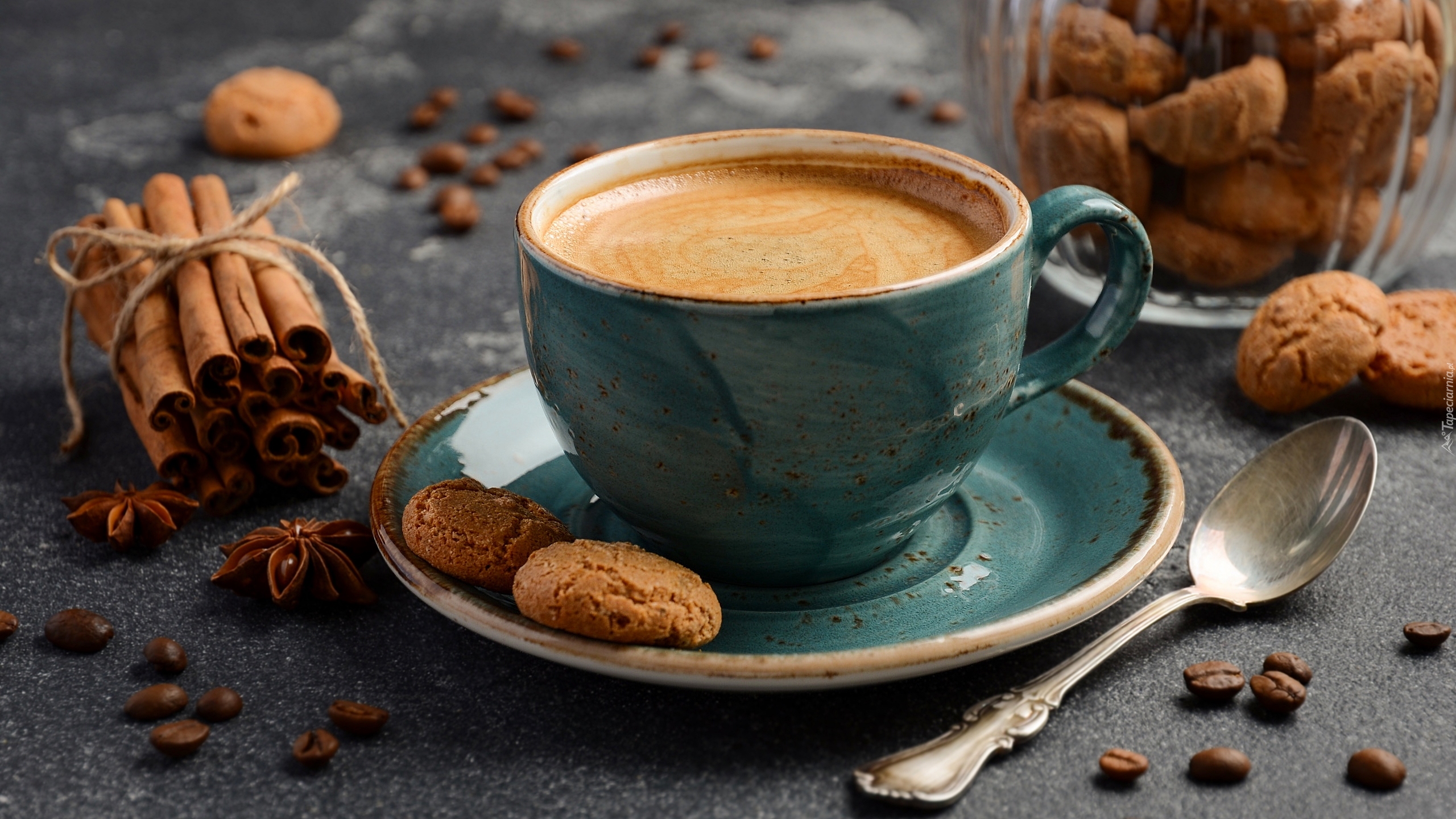Edytor tapety: Filiżanka kawy z ciasteczkami na spodku