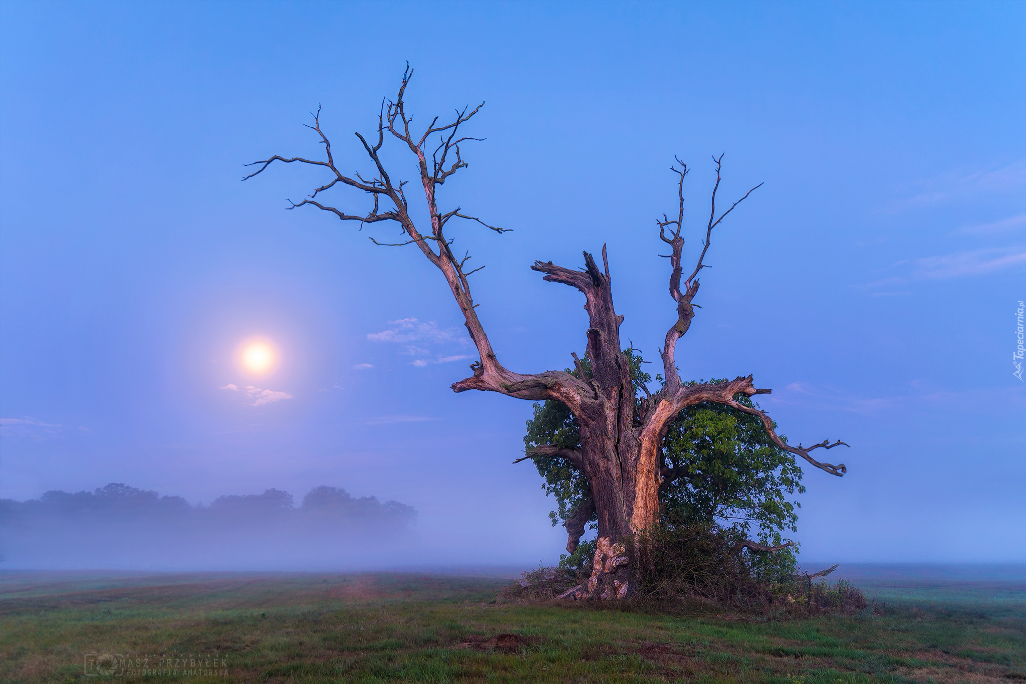 Edytor tapety: Uschnięty pień i konary drzewa na zamglonym polu