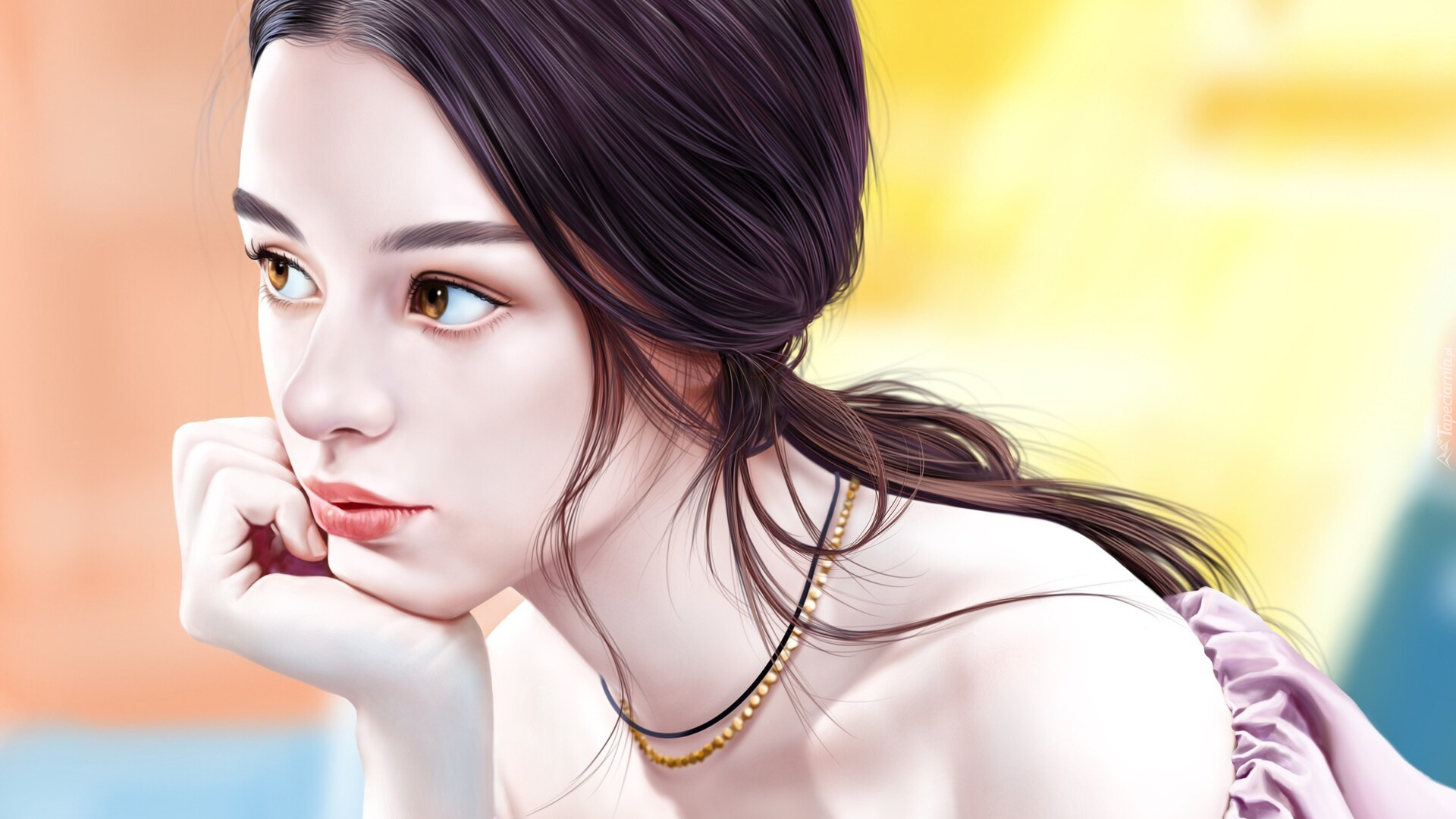 Edytor tapety: Zamyślona kobieta z koralami w grafice