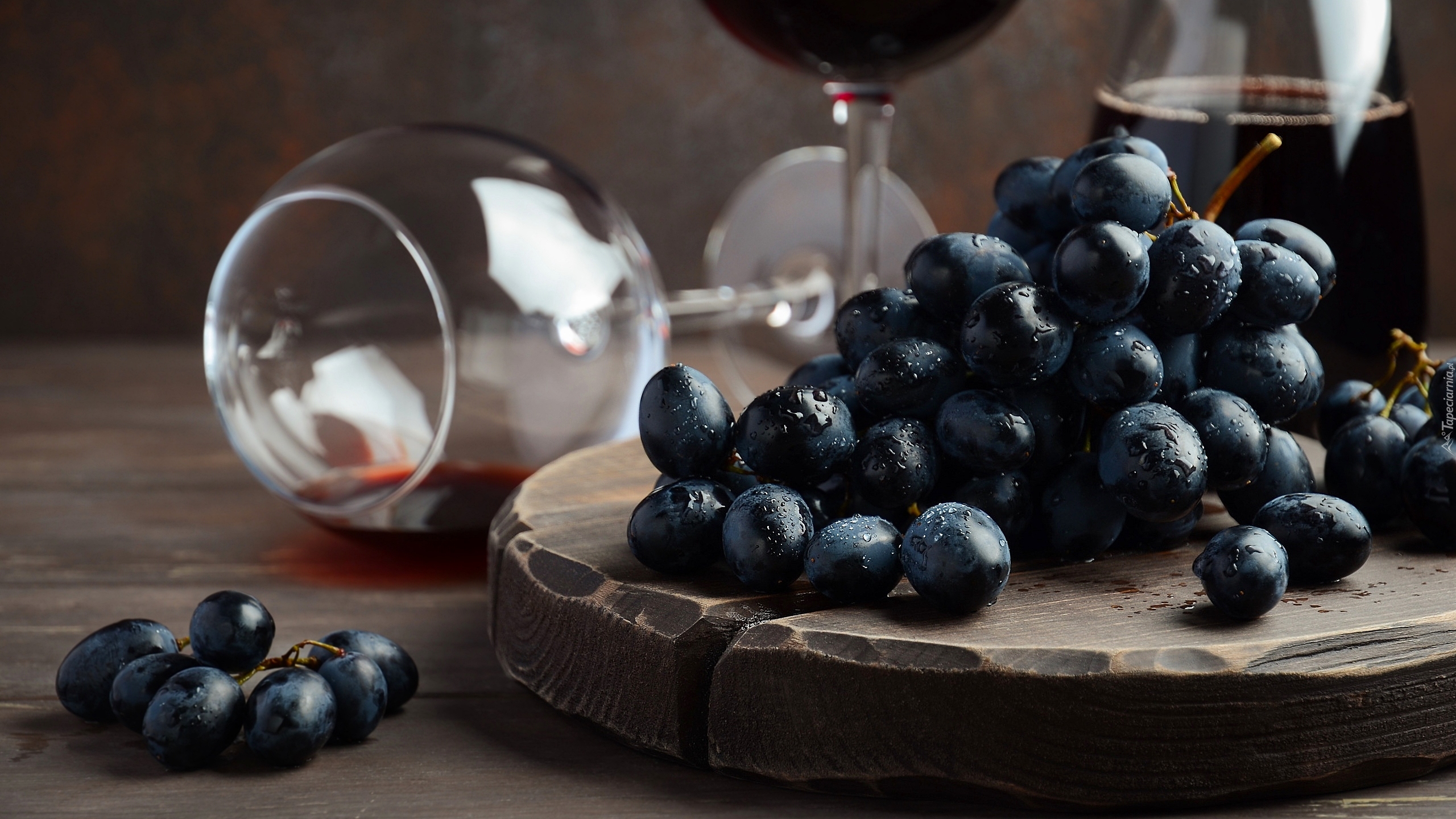 Edytor tapety: Winogrona na desce obok kieliszka