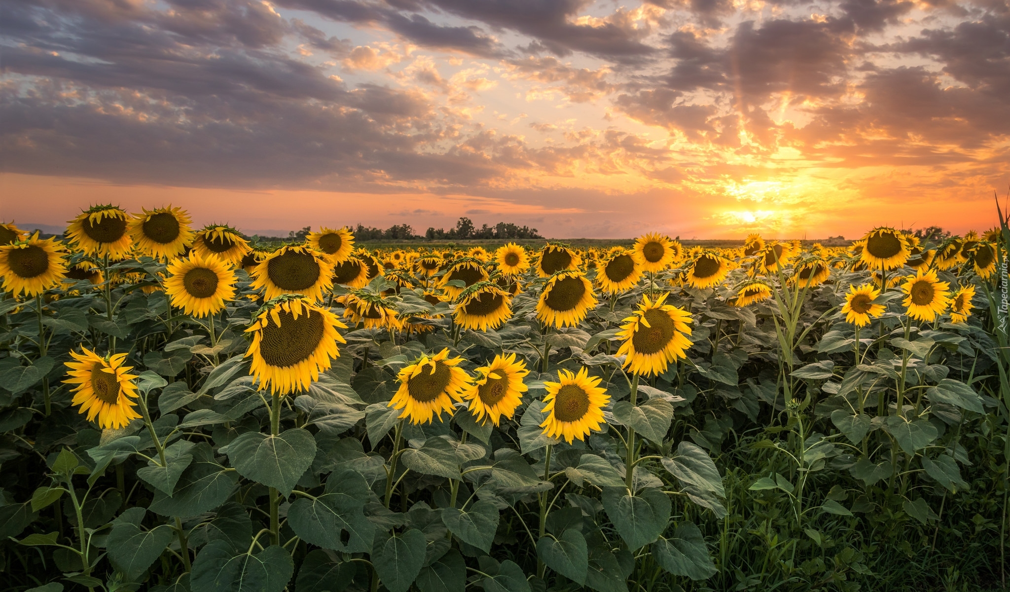 Edytor tapety: Wschód słońca nad polem słoneczników
