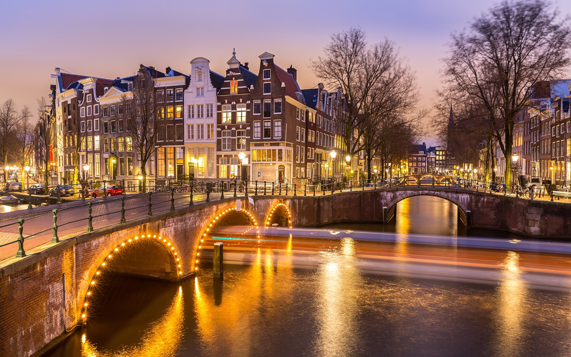 Edytor tapety: Oświetlony most i domy nad kanałem w Amsterdamie