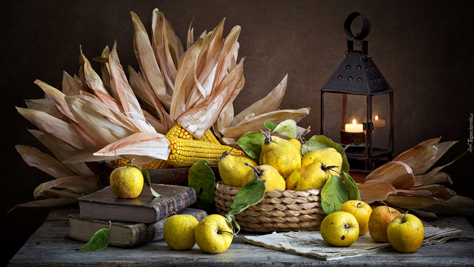 Edytor tapety: Lampion obok koszyków z kukurydzą i gruszkami
