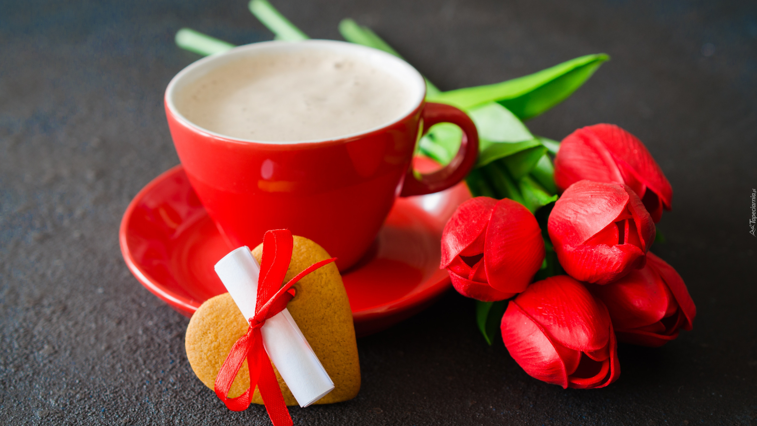 Edytor tapety: Tulipany obok filiżanki kawy i ciasteczkiem z liścikiem