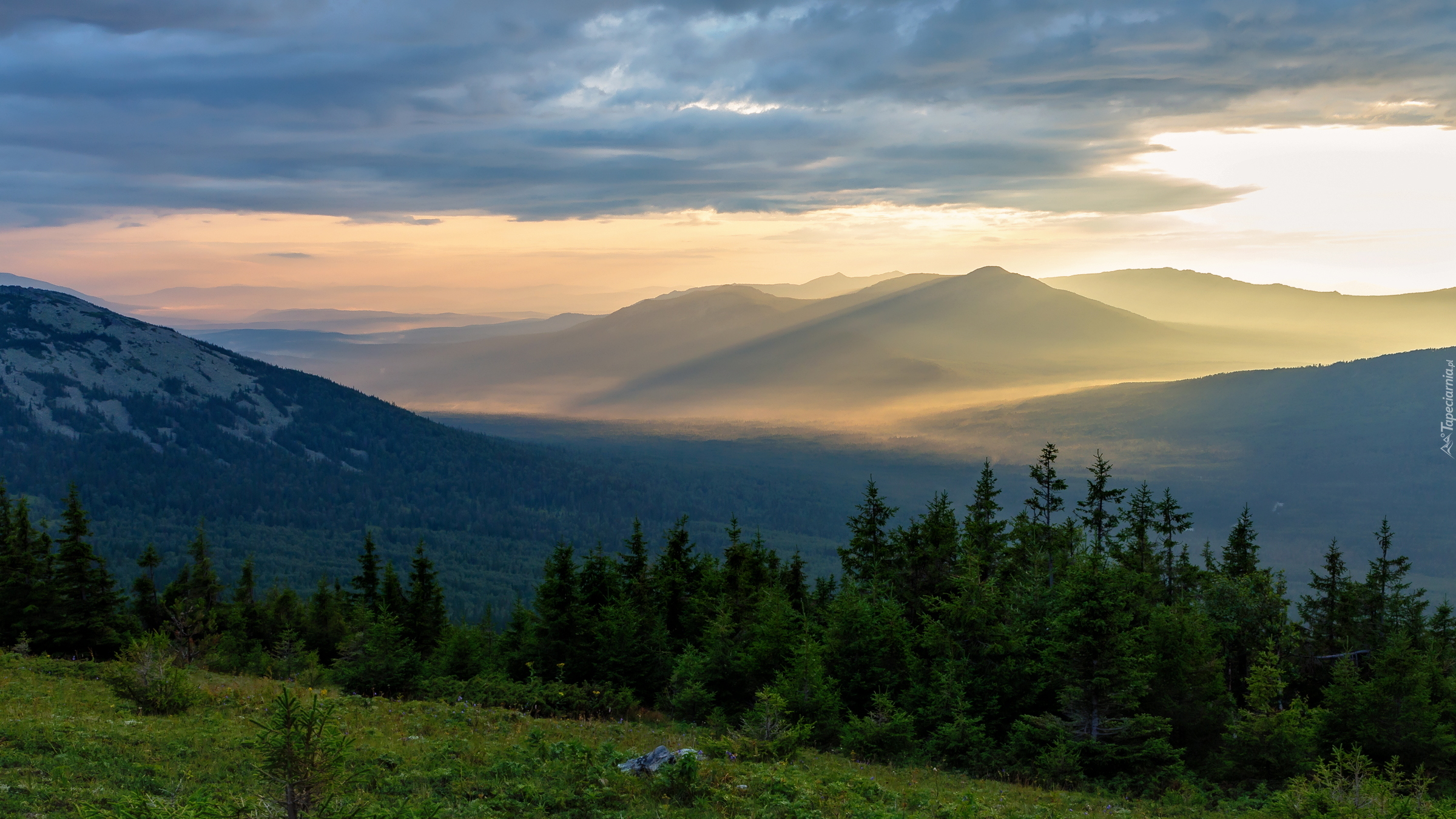 Edytor tapety: Zamglone góry o wschodzie słońca