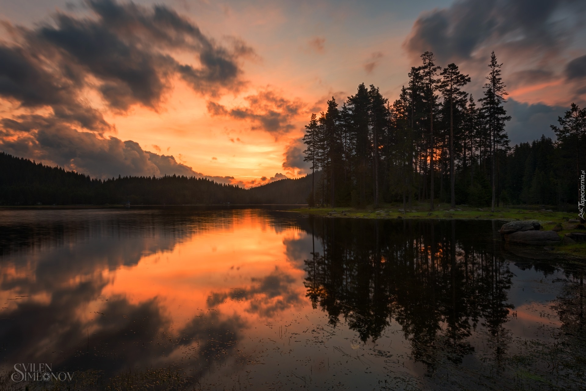 Edytor tapety: Widok na drzewa nad jeziorem o zachodzie słońca
