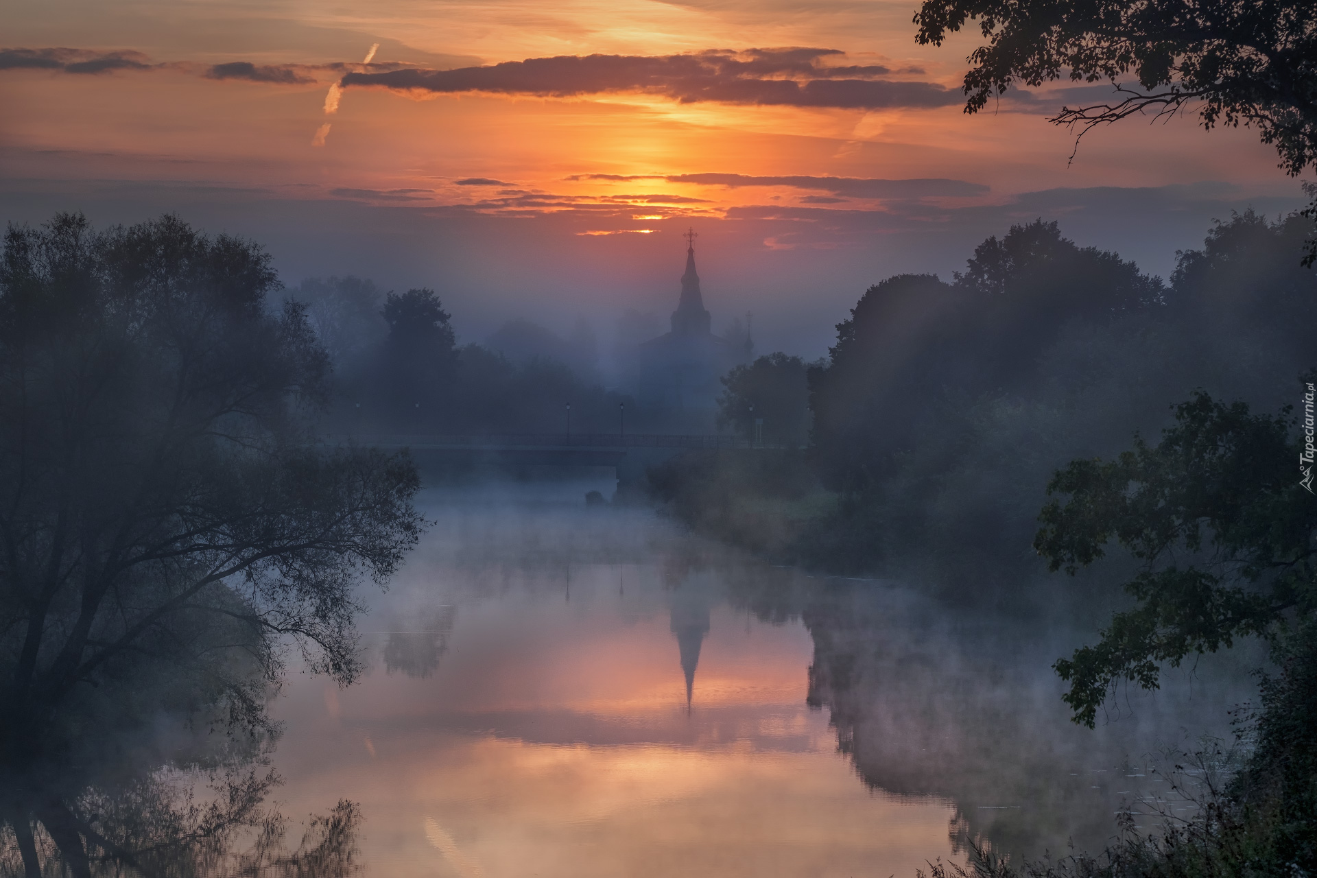 Edytor tapety: Cerkiew i rzeka Kamienka we mgle
