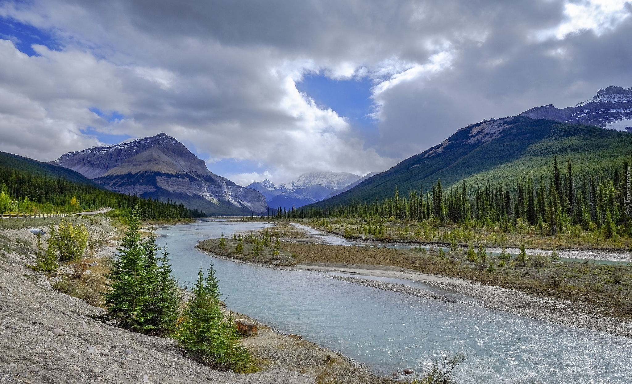Edytor tapety: Drzewa obok rzeki na tle gór