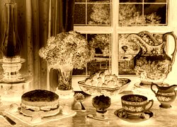 Edytor tapety: Ciasto i truskawki obok dzbanka i lampy naftowej przy oknie