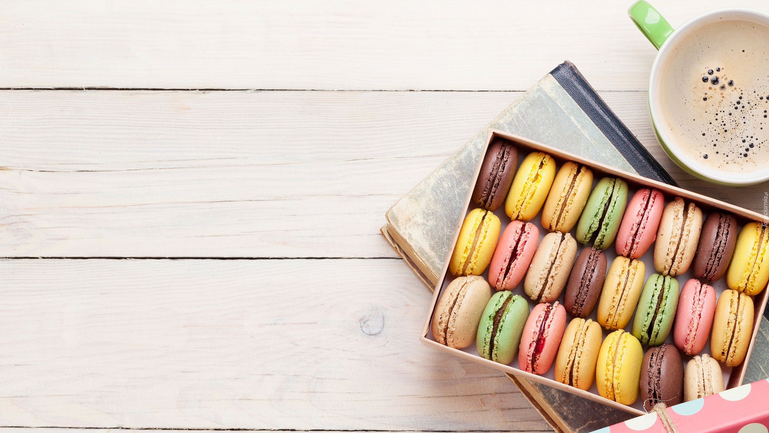 Edytor tapety: Pudełko ciasteczek na książce obok kawy