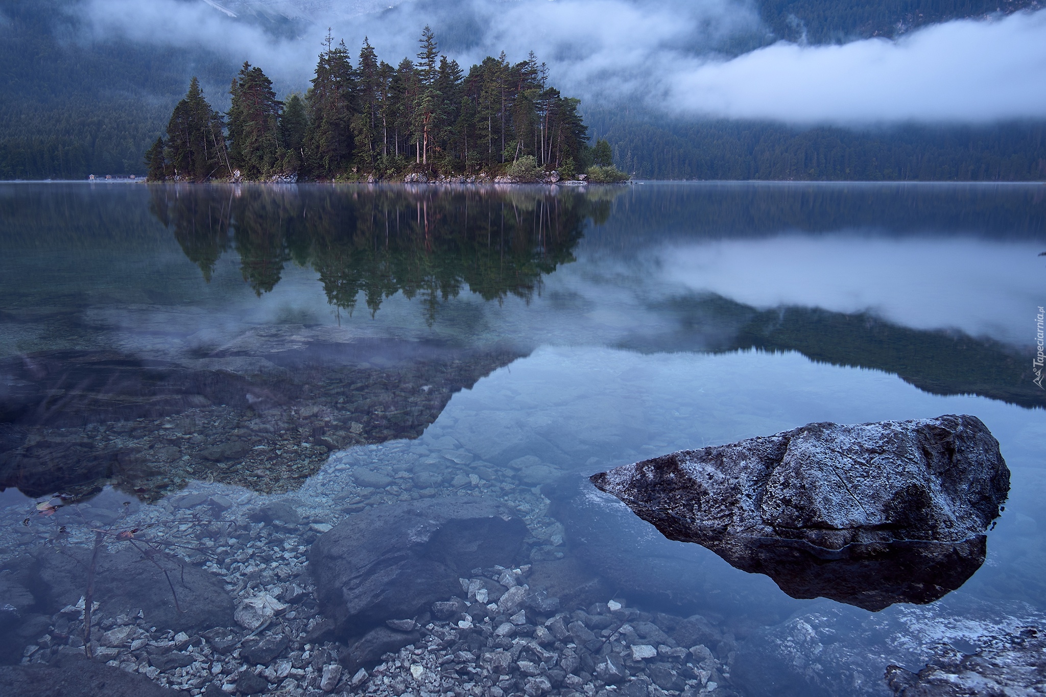 Edytor tapety: Wysepka porośnięta drzewami na jeziorze Eibsee