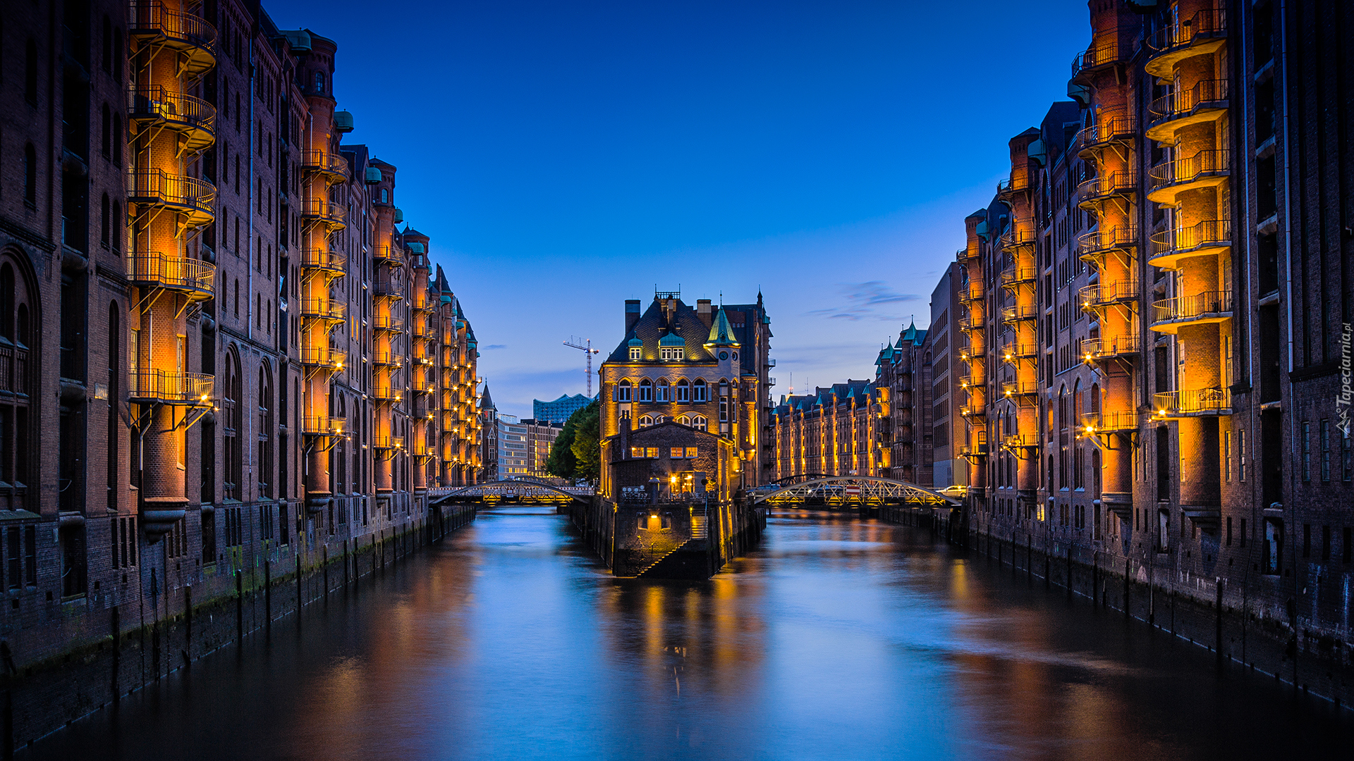 Edytor tapety: Restauracja Wasserschloss pomiędzy domami na kanale w Hamburgu