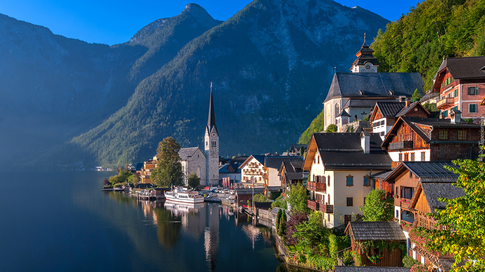 Edytor tapety: Przystań i domy w miasteczku Hallstatt w Austrii