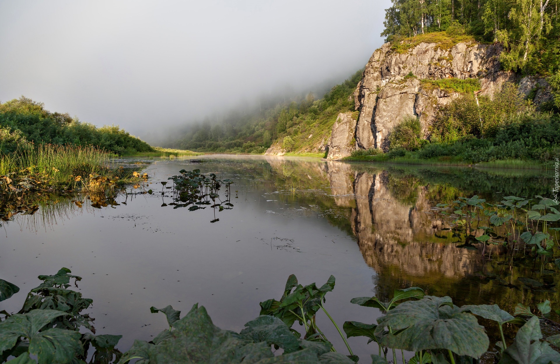 Edytor tapety: Mglisty poranek nad lasem przy rzece