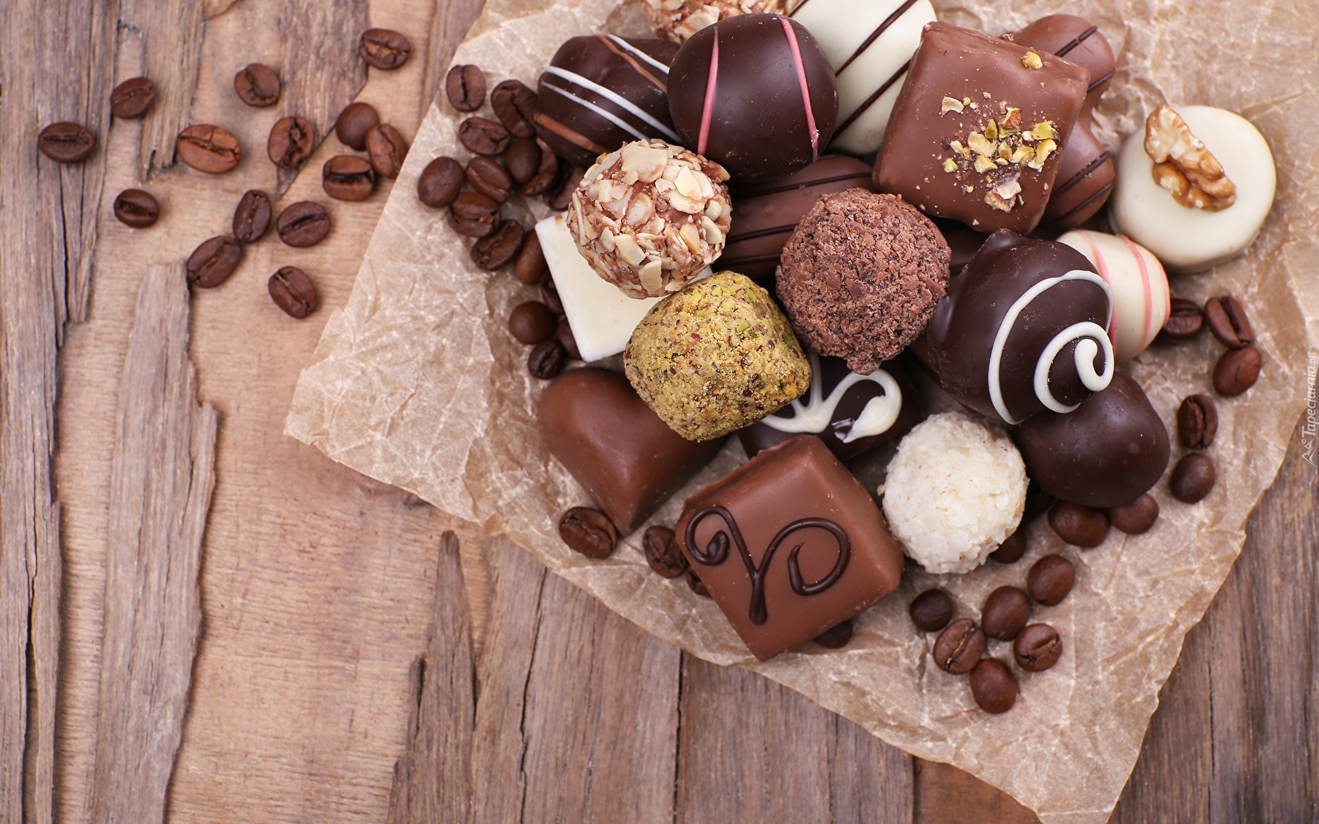 Edytor tapety: Czekoladowe pralinki i ziarna kawy na deskach