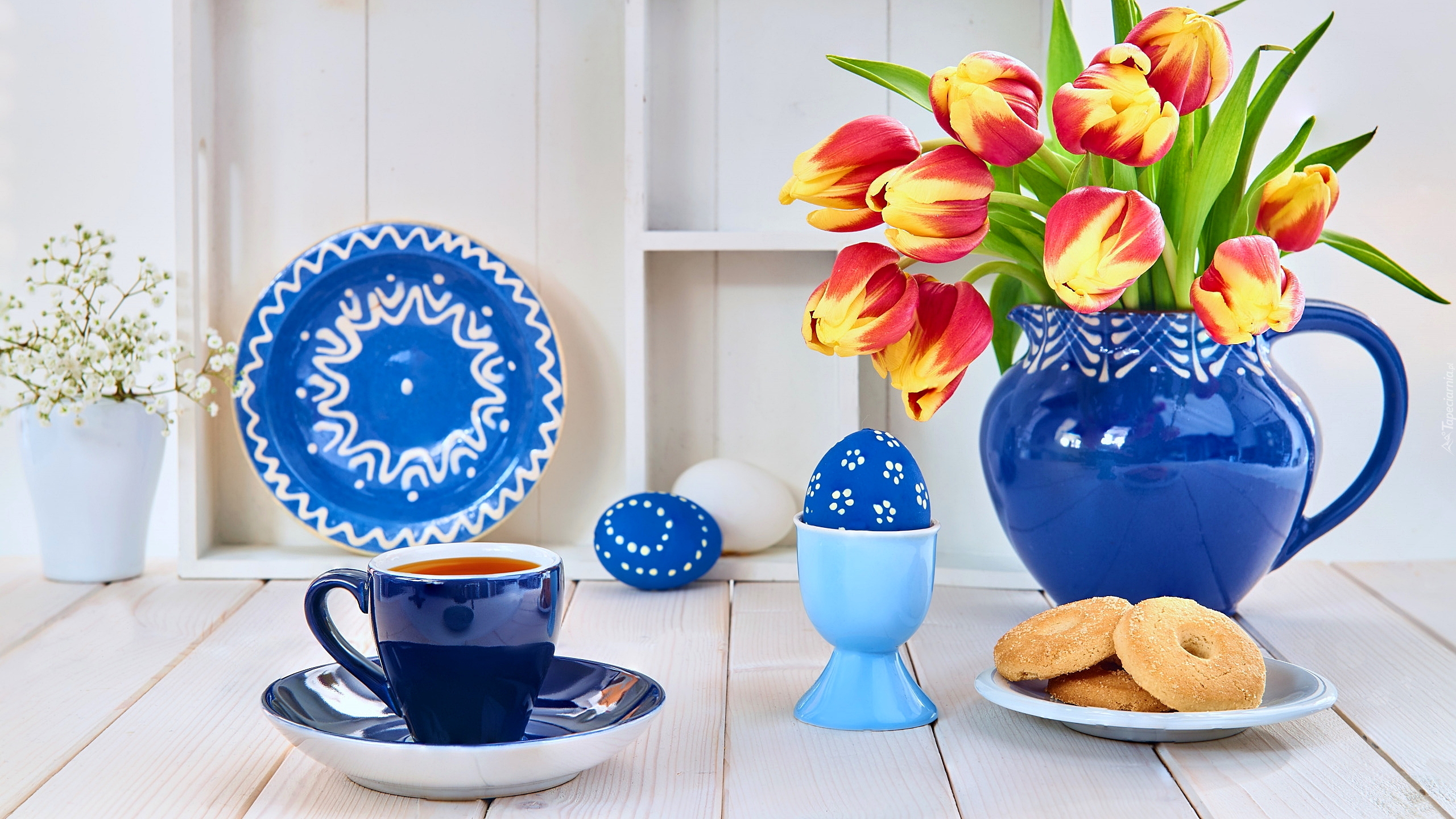 Edytor tapety: Bukiet tulipanów obok pisanek i kubka z herbatą