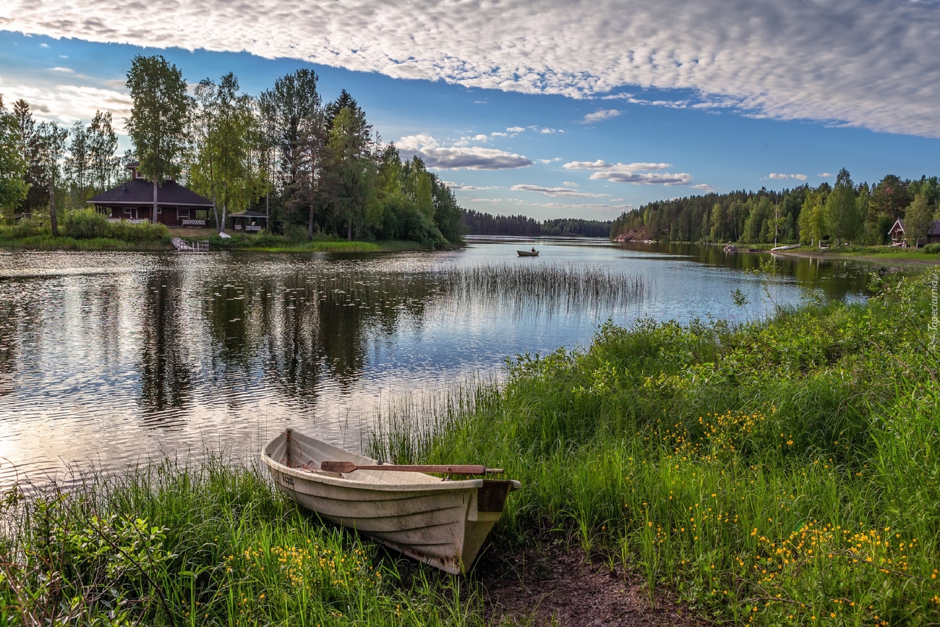 Edytor tapety: Domki i łódka na brzegu jeziora