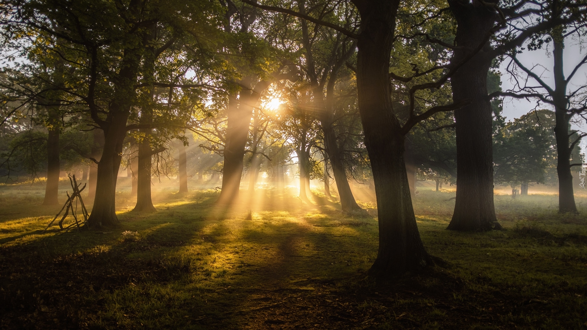 Edytor tapety: Przebijające wśród drzew promienie słoneczne