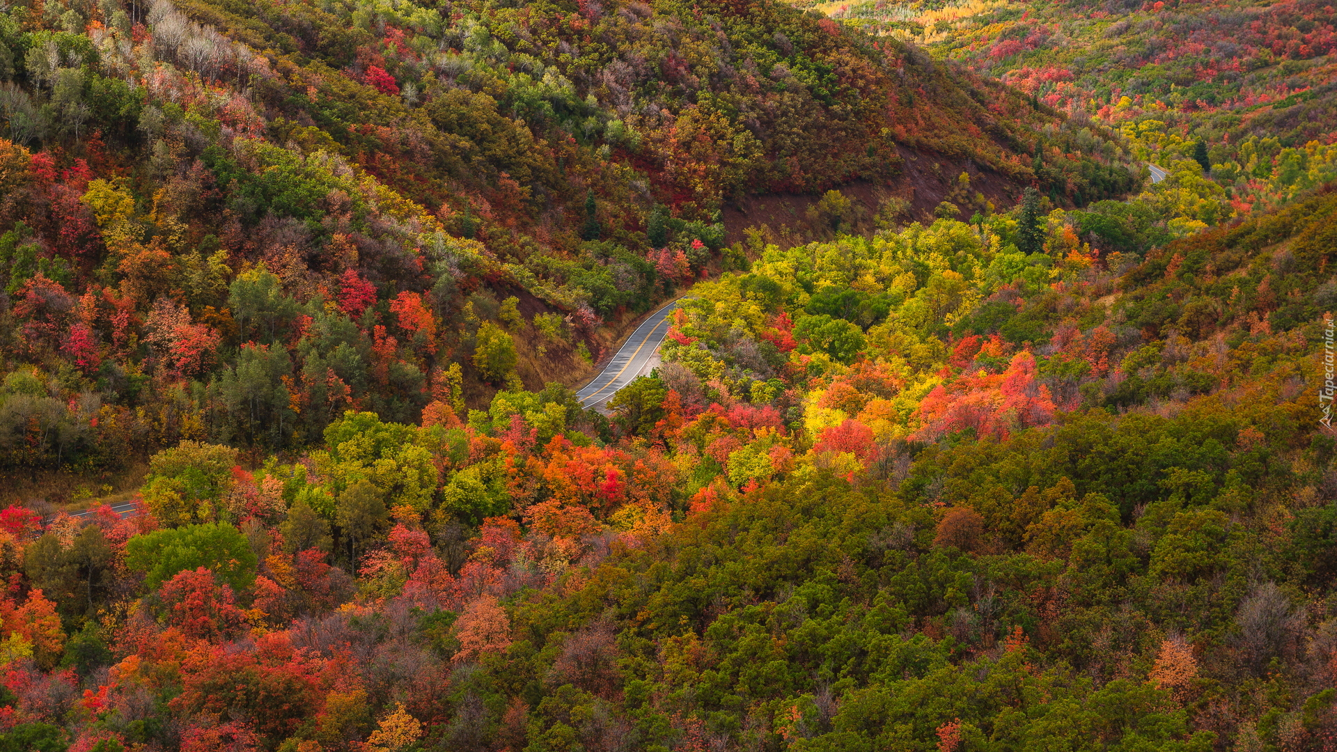 Edytor tapety: Droga w górskim jesiennym lesie