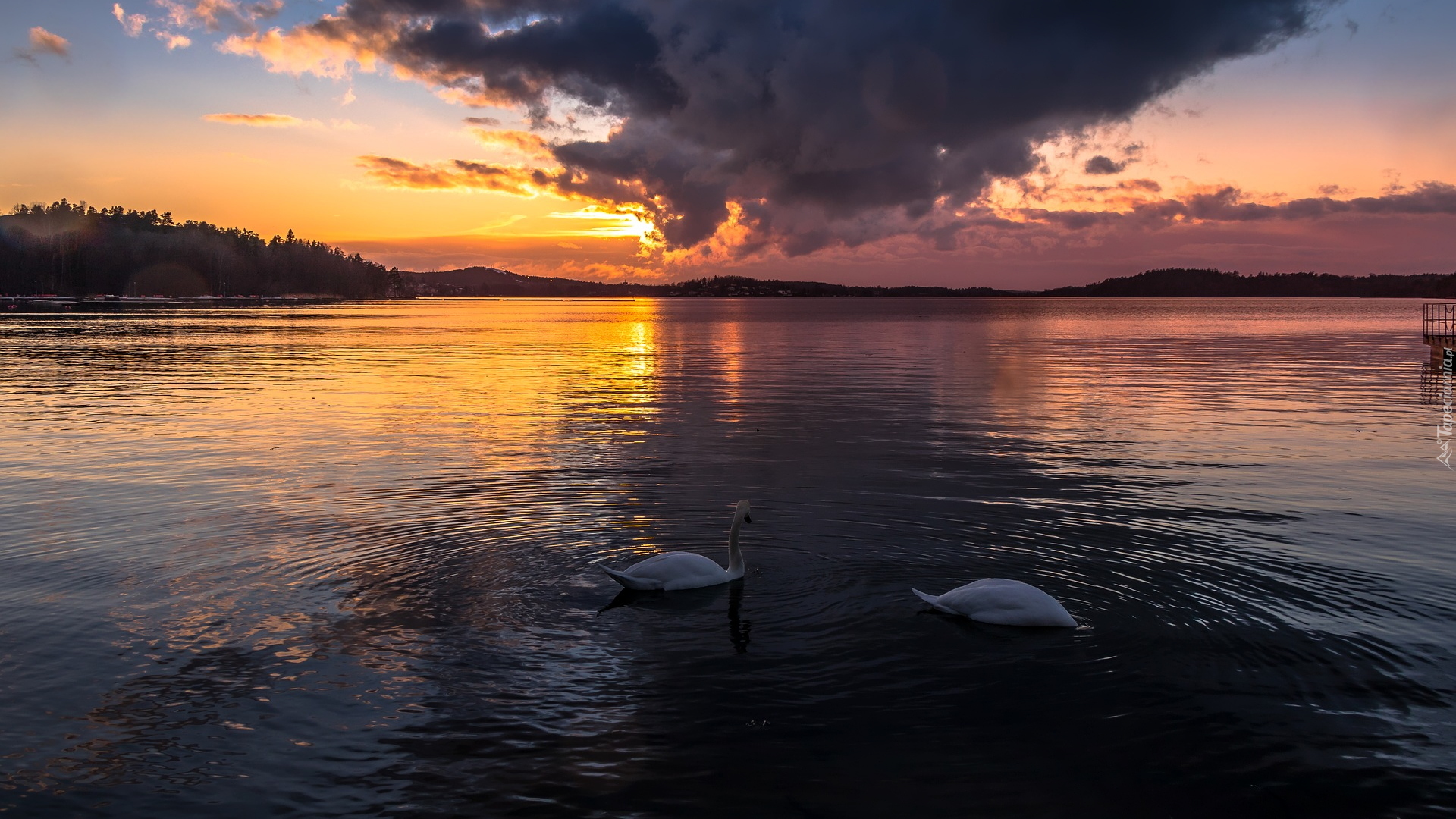 Edytor tapety: Łabędzie na jeziorze pod ciemnymi chmurami
