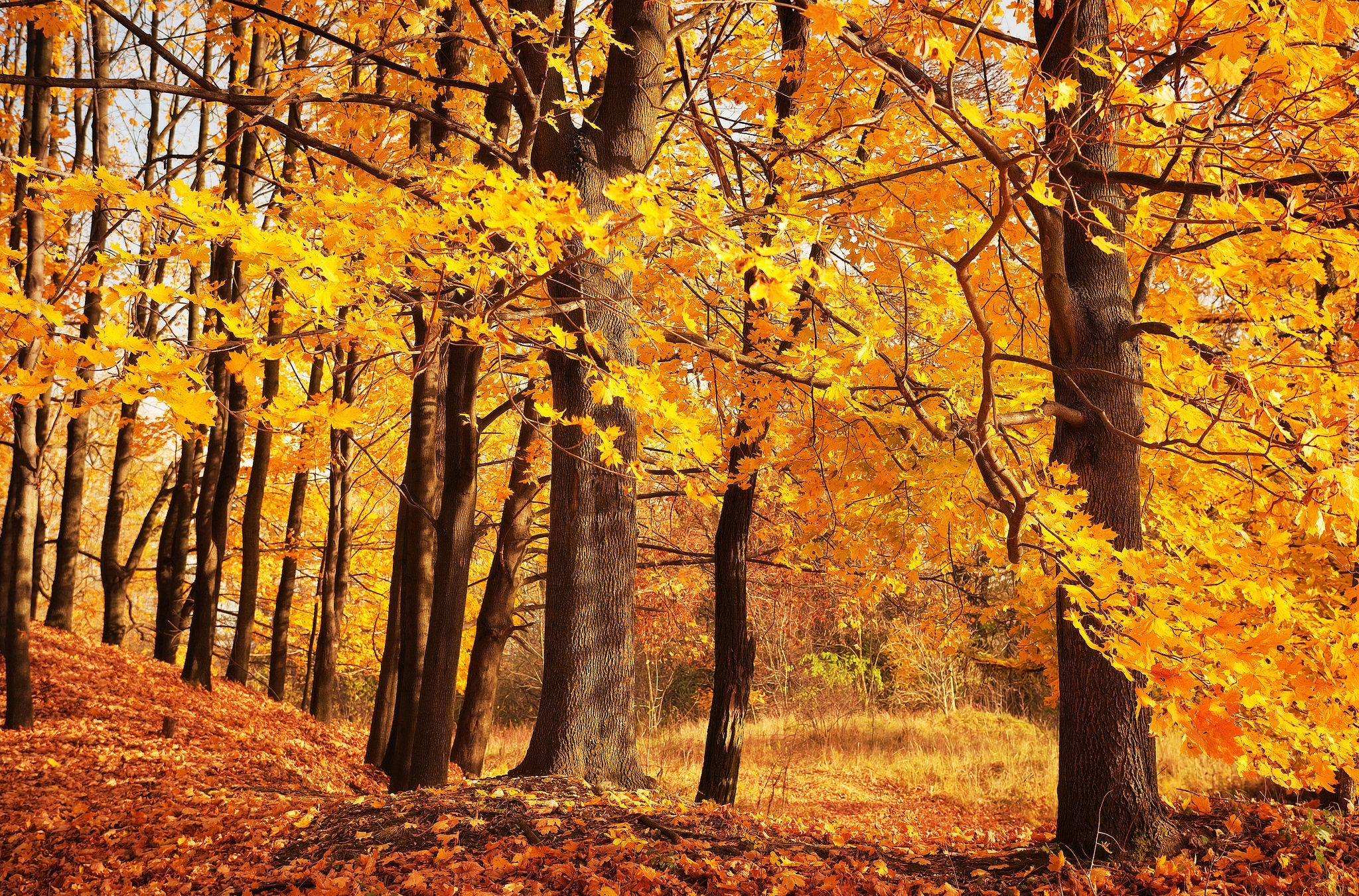 Edytor tapety: Liście opadające z drzew w lesie jesienią