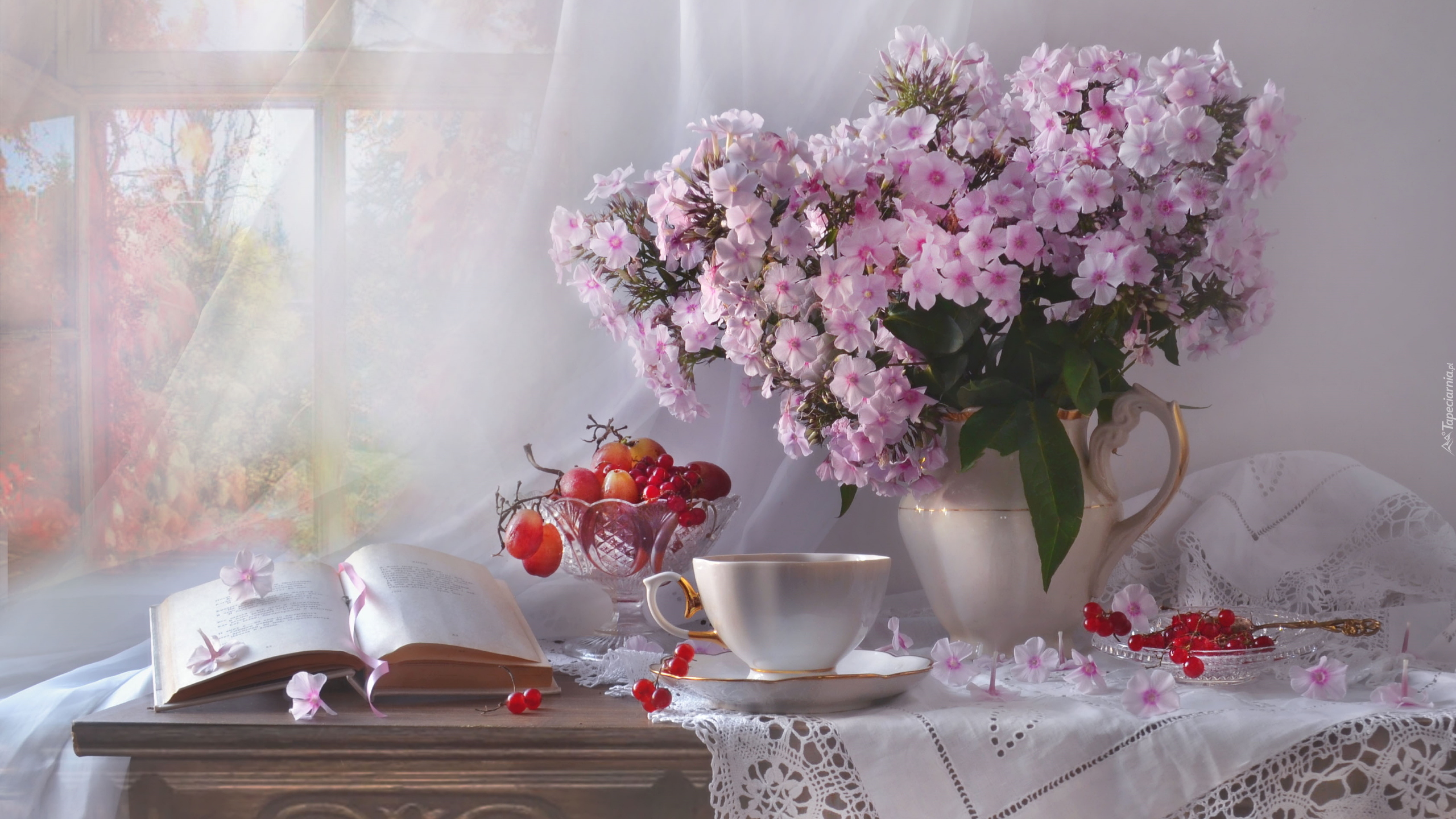 Edytor tapety: Książka i filiżanka obok bukietu floksów w dzbanku