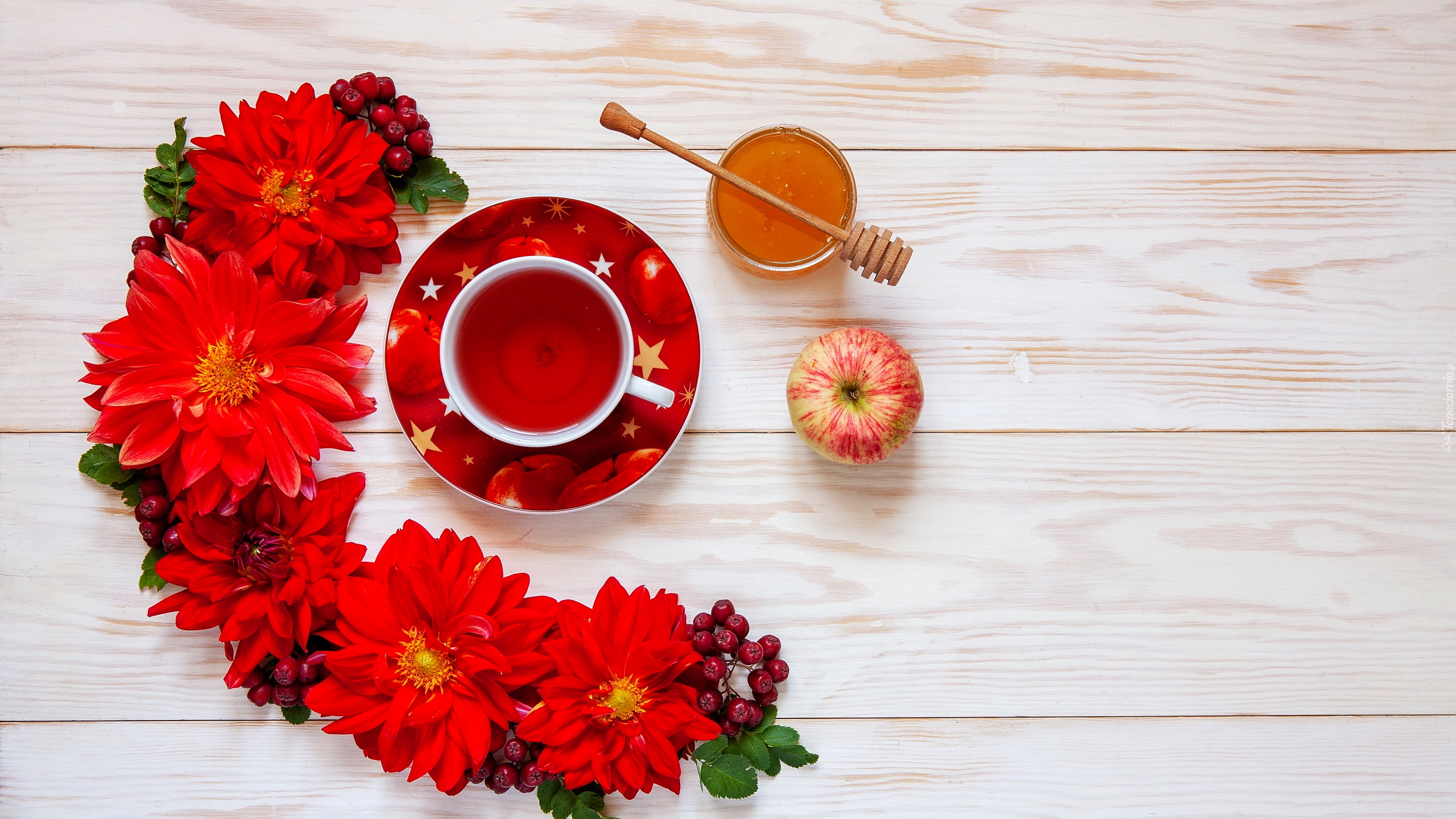 Edytor tapety: Filiżanka herbaty obok czerwonych kwiatów