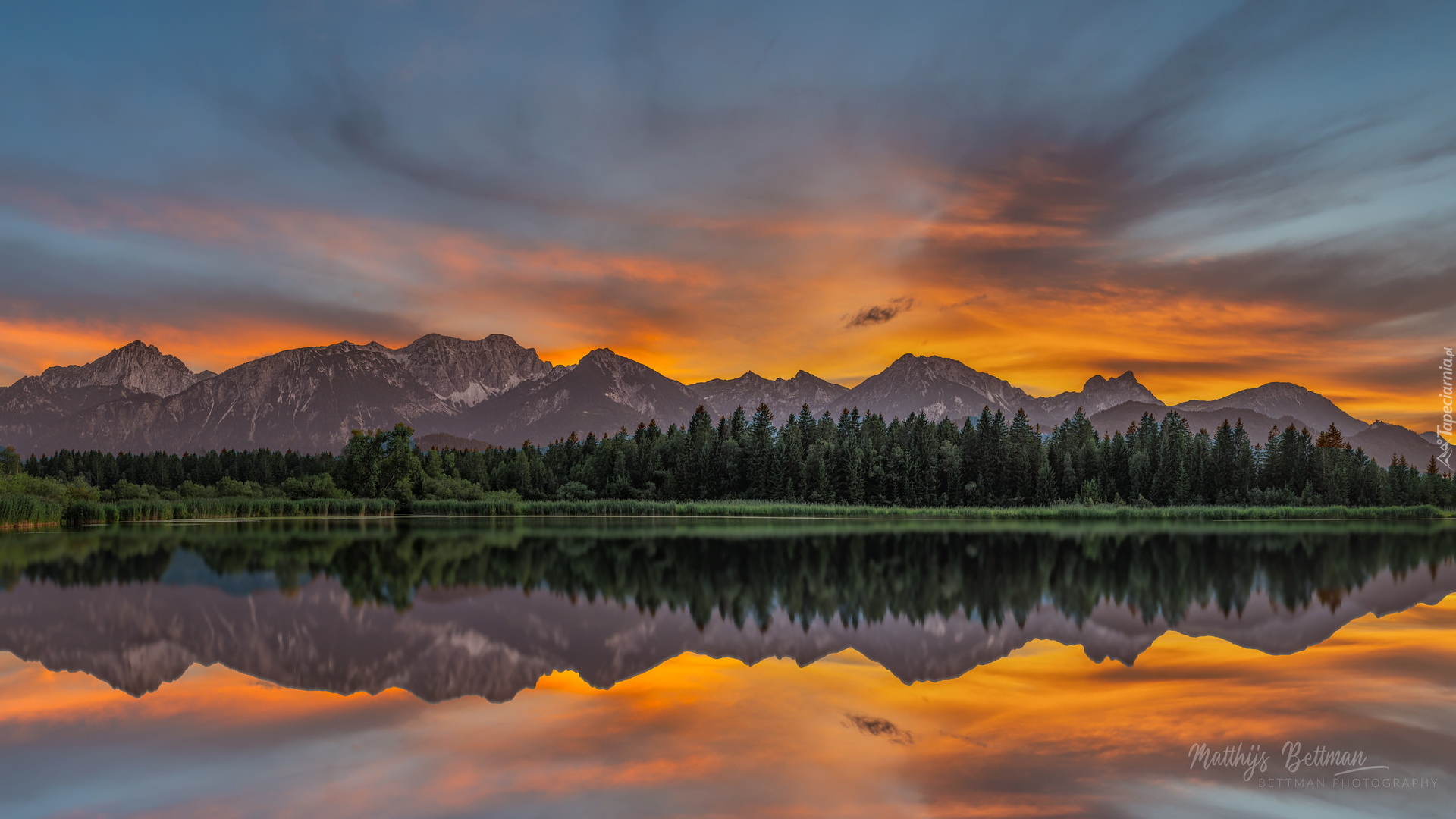 Edytor tapety: Odbicie zachodzącego słońca i gór w jeziorze