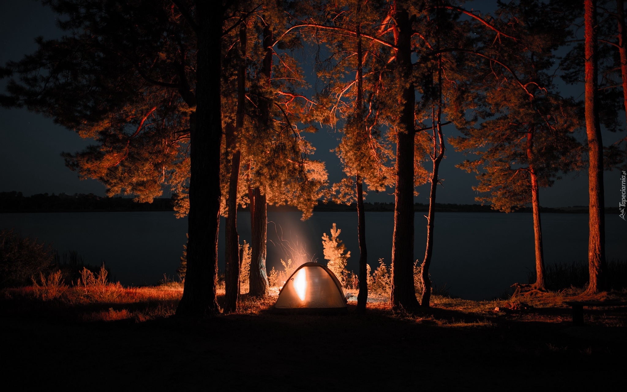 Edytor tapety: Oświetlony namiot pomiędzy drzewami nad jeziorem