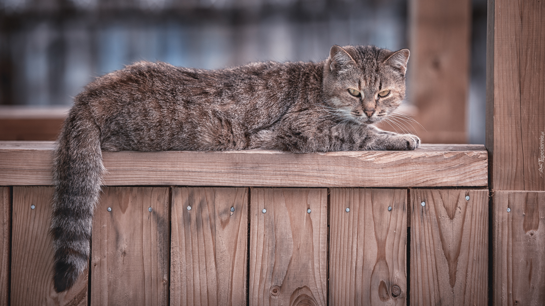 Edytor tapety: Bury kot na drewnianej poręczy